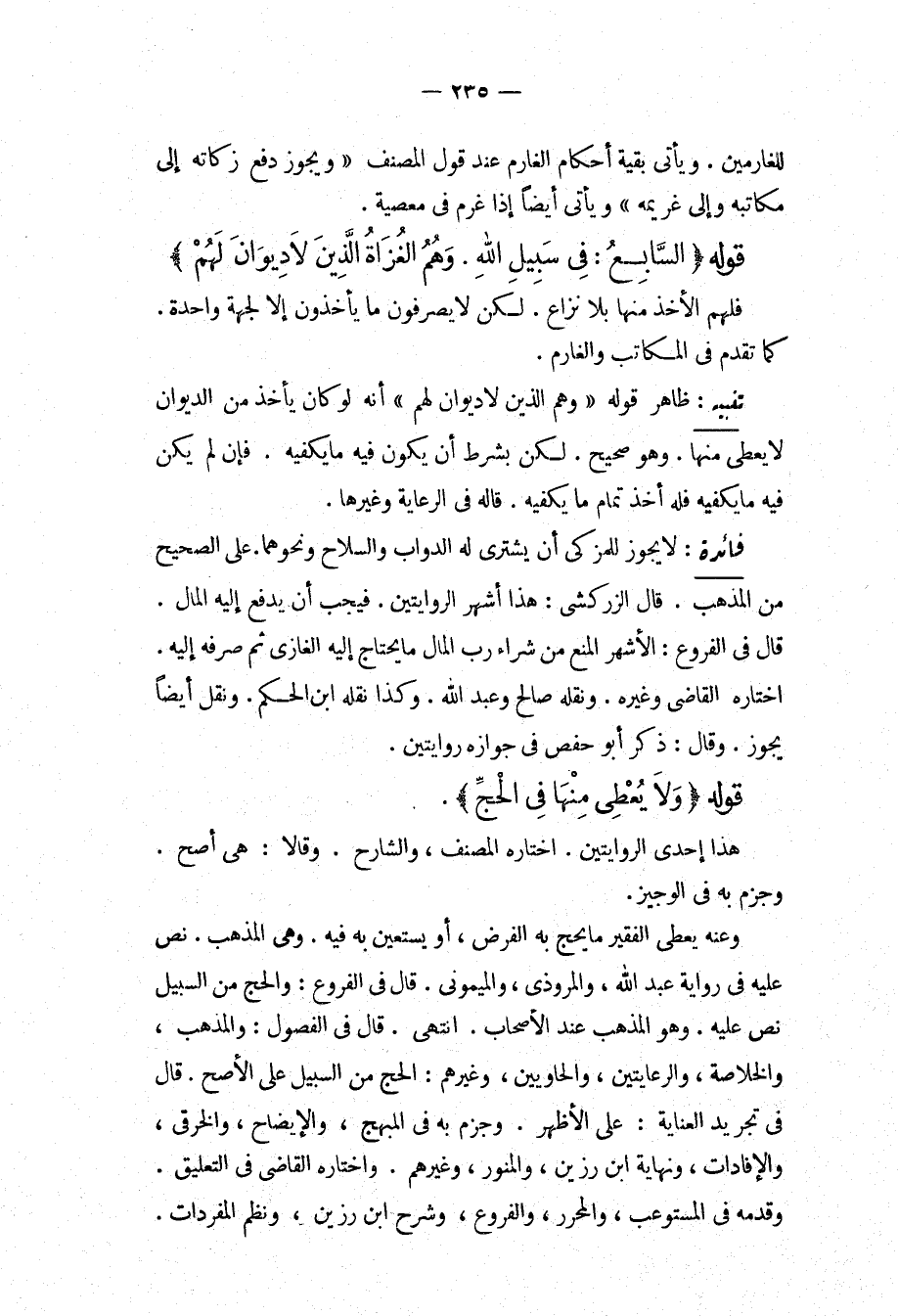 قَوْلُهُ (وَلَا يُعْطِي مِنْهَا فِي الْحَجِّ) هَذَا إحْدَى الرِّوَايَتَيْنِ، اخْتَارَهُ الْمُصَنِّفُ، وَالشَّارِحُ، وَقَالَا: هِيَ أَصَحُّ، وَجَزَمَ بِهِ فِي الْوَجِيزِ، وَعَنْهُ يُعْطِي الْفَقِيرَ مَا يَحُجُّ بِهِ الْفَرْضَ، أَوْ يَسْتَعِينُ بِهِ فِيهِ، وَهِيَ الْمَذْهَبُ، نَصَّ عَلَيْهِ فِي رِوَايَةِ عَبْدِ اللَّهِ، وَالْمَرُّوذِيِّ، وَالْمَيْمُونِيِّ. قَالَ فِي الْفُرُوعِ: وَالْحَجُّ مِنْ السَّبِيلِ نَصَّ عَلَيْهِ، وَهُوَ الْمَذْهَبُ عِنْدَ الْأَصْحَابِ. انْتَهَى. قَالَ فِي الْفُصُولِ: وَالْمُذْهَبِ، وَالْخُلَاصَةِ، وَالرِّعَايَتَيْنِ، وَالْحَاوِيَيْنِ، وَغَيْرِهِمْ: الْحَجُّ مِنْ السَّبِيلِ عَلَى الْأَصَحِّ. قَالَ فِي تَجْرِيدِ الْعِنَايَةِ: عَلَى الْأَظْهَرِ، وَجَزَمَ بِهِ فِي الْمُبْهِجِ، وَالْإِيضَاحِ، وَالْخِرَقِيِّ، وَالْإِفَادَاتِ، وَنِهَايَةِ ابْنِ رَزِينٍ، وَالْمُنَوِّرِ، وَغَيْرِهِمْ، وَاخْتَارَهُ الْقَاضِي فِي التَّعْلِيقِ، وَقَدَّمَهُ فِي الْمُسْتَوْعِبِ، وَالْمُحَرَّرِ، وَالْفُرُوعِ، وَشَرْحِ ابْنِ رَزِينٍ، وَنَظْمِ الْمُفْرَدَاتِ.
