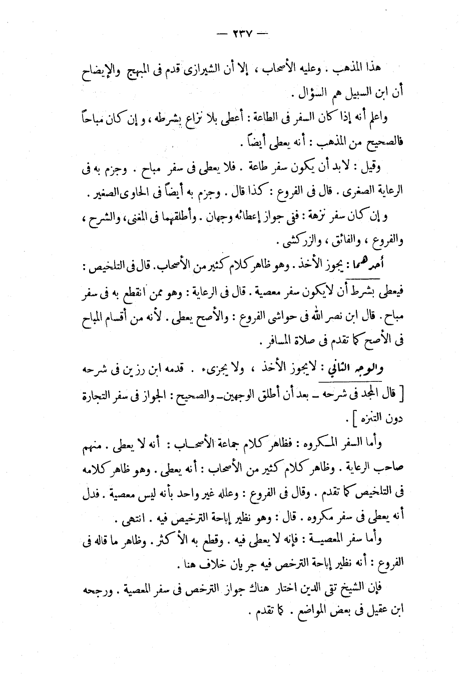 هَذَا الْمَذْهَبُ، وَعَلَيْهِ الْأَصْحَابُ، إلَّا أَنَّ الشِّيرَازِيَّ قَدَّمَ فِي الْمُبْهِجِ وَالْإِيضَاحِ أَنَّ ابْنَ السَّبِيلِ هُمْ السُّؤَالُ، وَاعْلَمْ أَنَّهُ إذَا كَانَ السَّفَرُ فِي الطَّاعَةِ: أُعْطِيَ بِلَا نِزَاعٍ بِشَرْطٍ، وَإِنْ كَانَ مُبَاحًا فَالصَّحِيحُ مِنْ الْمَذْهَبِ: أَنَّهُ يُعْطَى أَيْضًا، وَقِيلَ: لَا بُدَّ أَنْ يَكُونَ سَفَرَ طَاعَةٍ، فَلَا يُعْطَى فِي سَفَرٍ مُبَاحٍ، وَجَزَمَ بِهِ فِي الرِّعَايَةِ الصُّغْرَى. قَالَ فِي الْفُرُوعِ: كَذَا قَالَ، وَجَزَمَ بِهِ أَيْضًا فِي الْحَاوِي الصَّغِيرِ، وَإِنْ كَانَ سَفَرَ نُزْهَةٍ: فَفِي جَوَازِ إعْطَائِهِ وَجْهَانِ، وَأَطْلَقَهُمَا فِي الْمُغْنِي، وَالشَّرْحِ، وَالْفُرُوعِ، وَالْفَائِقِ، وَالزَّرْكَشِيُّ. أَحَدُهُمَا: يَجُوزُ الْأَخْذُ، وَهُوَ ظَاهِرُ كَلَامِ كَثِيرٍ مِنْ الْأَصْحَابِ. قَالَ فِي التَّلْخِيصِ: فَيُعْطَى بِشَرْطِ أَنْ لَا يَكُونَ سَفَرَ مَعْصِيَةٍ. قَالَ فِي الرِّعَايَةِ: وَهُوَ مِمَّنْ انْقَطَعَ بِهِ فِي سَفَرٍ مُبَاحٍ. قَالَ ابْنُ نَصْرِ اللَّهِ فِي حَوَاشِي الْفُرُوعِ: وَالْأَصَحُّ يُعْطَى؛ لِأَنَّهُ مِنْ أَقْسَامِ الْمُبَاحِ فِي الْأَصَحِّ كَمَا تَقَدَّمَ فِي صَلَاةِ الْمُسَافِرِ، وَالْوَجْهُ الثَّانِي: لَا يَجُوزُ الْأَخْذُ، وَلَا يُجْزِئُ، قَدَّمَهُ ابْنُ رَزِينٍ فِي شَرْحِهِ [قَالَ الْمَجْدُ فِي شَرْحِهِ بَعْدَ أَنْ أَطْلَقَ الْوَجْهَيْنِ وَالصَّحِيحُ: الْجَوَازُ فِي سَفَرِ التِّجَارَةِ دُونَ التَّنَزُّهِ] ، وَأَمَّا السَّفَرُ الْمَكْرُوهُ: فَظَاهِرُ كَلَامِ جَمَاعَةِ الْأَصْحَابِ: أَنَّهُ لَا يُعْطَى. مِنْهُمْ صَاحِبُ الرِّعَايَةِ، وَظَاهِرُ كَلَامِ كَثِيرٍ مِنْ الْأَصْحَابِ: أَنَّهُ يُعْطَى، وَهُوَ ظَاهِرُ كَلَامِهِ فِي التَّلْخِيصِ كَمَا تَقَدَّمَ، وَقَالَ فِي الْفُرُوعِ: وَعَلَّلَهُ غَيْرُ وَاحِدٍ بِأَنَّهُ لَيْسَ مَعْصِيَةً، فَدَلَّ أَنَّهُ يُعْطَى فِي سَفَرٍ مَكْرُوهٍ. قَالَ: وَهُوَ نَظِيرُ إبَاحَةِ التَّرْخِيصِ فِيهِ. انْتَهَى. وَأَمَّا سَفَرُ الْمَعْصِيَةِ: فَإِنَّهُ لَا يُعْطَى فِيهِ، وَقَطَعَ بِهِ الْأَكْثَرُ، وَظَاهِرُ مَا قَالَهُ فِي الْفُرُوعِ: أَنَّهُ نَظِيرُ إبَاحَةِ التَّرَخُّصِ فِيهِ جَرَيَانُ خِلَافٍ هُنَا، فَإِنَّ الشَّيْخَ تَقِيَّ الدِّينِ اخْتَارَ هُنَاكَ جَوَازَ التَّرَخُّصِ فِي سَفَرِ الْمَعْصِيَةِ، وَرَجَّحَهُ ابْنُ عَقِيلٍ فِي بَعْضِ الْمَوَاضِعِ. كَمَا تَقَدَّمَ.
