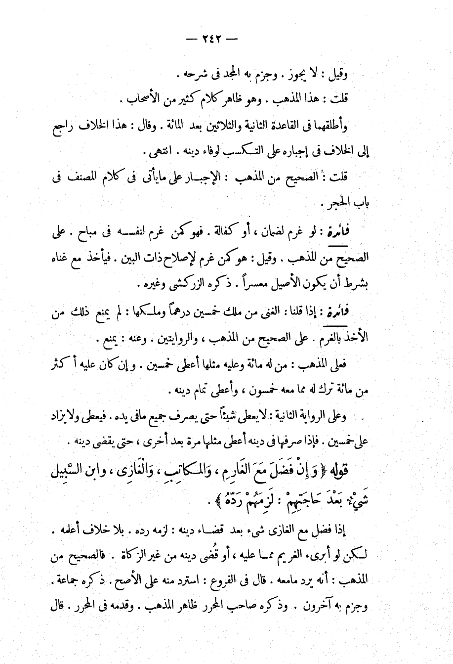 قَوْلُهُ (وَإِنْ فَضَلَ مَعَ الْغَارِمِ، وَالْمُكَاتَبِ، وَالْغَازِي، وَابْنِ السَّبِيلِ شَيْءٌ بَعْدَ حَاجَتِهِمْ: لَزِمَهُمْ رَدُّهُ) . إذَا فَضَلَ مَعَ الْغَازِي شَيْءٌ بَعْدَ قَضَاءِ دَيْنِهِ: لَزِمَ رَدُّهُ. بِلَا خِلَافٍ أَعْلَمُهُ. لَكِنْ لَوْ أُبْرِئَ الْغَرِيمُ مِمَّا عَلَيْهِ، أَوْ قَضَى دَيْنَهُ مِنْ غَيْرِ الزَّكَاةِ، فَالصَّحِيحُ مِنْ الْمَذْهَبِ: أَنَّهُ يَرُدُّ مَا مَعَهُ. قَالَ فِي الْفُرُوعِ: اسْتَرَدَّ مِنْهُ عَلَى الْأَصَحِّ. ذَكَرَهُ جَمَاعَةٌ، وَجَزَمَ بِهِ آخَرُونَ، وَذَكَرَهُ صَاحِبُ الْمُحَرَّرِ ظَاهِرُ الْمَذْهَبِ، وَقَدَّمَهُ فِي الْمُحَرَّرِ. قَالَ