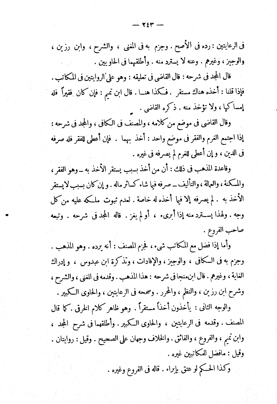 فِي الرِّعَايَتَيْنِ: رَدَّهُ فِي الْأَصَحِّ، وَجَزَمَ بِهِ فِي الْمُغْنِي، وَالشَّرْحِ، وَابْنِ رَزِينٍ، وَالْوَجِيزِ، وَغَيْرِهِمْ. وَعَنْهُ لَا يَسْتَرِدُّ مِنْهُ. وَأَطْلَقَهُمَا فِي الْحَاوِيَيْنِ قَالَ الْمَجْدُ فِي شَرْحِهِ: قَالَ الْقَاضِي فِي تَعْلِيقِهِ: وَهُوَ عَلَى الرِّوَايَتَيْنِ فِي الْمُكَاتَبِ، فَإِذَا قُلْنَا: أَخْذُهُ هُنَاكَ مُسْتَقِرٌّ، فَكَذَا هُنَا. قَالَ ابْنُ تَمِيمٍ: فَإِنْ كَانَ فَقِيرًا فَلَهُ إمْسَاكُهَا، وَلَا تُؤْخَذُ مِنْهُ. ذَكَرَهُ الْقَاضِي، وَقَالَ الْقَاضِي فِي مَوْضِعٍ مِنْ كَلَامِهِ، وَالْمُصَنِّفُ فِي الْكَافِي، وَالْمَجْدُ فِي شَرْحِهِ: إذَا اجْتَمَعَ الْغُرْمُ وَالْفَقْرُ فِي مَوْضِعٍ وَاحِدٍ: أَخَذَ بِهِمَا، فَإِنْ أُعْطِيَ لِلْفَقْرِ فَلَهُ صَرْفُهُ فِي الدَّيْنِ، وَإِنْ أُعْطِيَ لِلْغُرْمِ لَمْ يَصْرِفْهُ فِي غَيْرِهِ، وَقَاعِدَةُ الْمَذْهَبِ فِي ذَلِكَ: أَنَّ مَنْ أَخَذَ بِسَبَبٍ يَسْتَقِرُّ الْأَخْذُ بِهِ وَهُوَ الْفَقْرُ، وَالْمَسْكَنَةُ، وَالْعِمَالَةُ، وَالتَّأْلِيفُ صَرَفَهُ فِيمَا شَاءَ كَسَائِرِ مَالِهِ، وَإِنْ كَانَ بِسَبَبٍ لَا يَسْتَقِرُّ الْأَخْذُ بِهِ. لَمْ يَصْرِفْهُ إلَّا فِيمَا أَخَذَهُ لَهُ خَاصَّةً. لِعَدَمِ ثُبُوتِ مِلْكِهِ عَلَيْهِ مِنْ كُلِّ وَجْهٍ، وَلِهَذَا يُسْتَرَدُّ مِنْهُ إذَا أُبْرِئَ، أَوْ لَمْ يَغْزُ. قَالَهُ الْمَجْدُ فِي شَرْحِهِ، وَتَبِعَهُ صَاحِبُ الْفُرُوعِ، وَأَمَّا إذَا فَضَلَ مَعَ الْمُكَاتَبِ شَيْءٌ، فَجَزَمَ الْمُصَنِّفُ: أَنَّهُ يَرُدُّهُ، وَهُوَ الْمَذْهَبُ، وَجَزَمَ بِهِ فِي الْكَافِي، وَالْوَجِيزِ، وَالْإِفَادَاتِ، وَتَذْكِرَةِ ابْنِ عَبْدُوسٍ، وَإِدْرَاكِ الْغَايَةِ، وَغَيْرِهِمْ. قَالَ ابْنُ مُنَجَّى فِي شَرْحِهِ: هَذَا الْمَذْهَبُ، وَقَدَّمَهُ فِي الْمُغْنِي، وَالشَّرْحِ، وَشَرْحِ ابْنِ رَزِينٍ، وَالنَّظْمِ، وَالْمُحَرَّرِ، وَصَحَّحَهُ فِي الرِّعَايَتَيْنِ، وَالْحَاوِي الْكَبِيرِ، وَالْوَجْهُ الثَّانِي: يَأْخُذُونَ أَخْذًا مُسْتَقِرًّا، وَهُوَ ظَاهِرُ كَلَامِ الْخِرَقِيِّ. كَمَا قَالَ الْمُصَنِّفُ، وَقَدَّمَهُ فِي الرِّعَايَتَيْنِ، وَالْحَاوِي الْكَبِيرِ، وَأَطْلَقَهُمَا فِي شَرْحِ الْمَجْدِ، وَابْنِ تَمِيمٍ، وَالْفُرُوعِ، وَالْفَائِقِ، وَالْخِلَافُ وَجْهَانِ عَلَى الصَّحِيحِ، وَقِيلَ: رِوَايَتَانِ، وَقِيلَ: مَا فَضَلَ لِلْمُكَاتَبِينَ غَيْرُهُ، وَكَذَا الْحُكْمُ لَوْ عَتَقَ بِإِبْرَاءٍ. قَالَهُ فِي الْفُرُوعِ وَغَيْرِهِ.