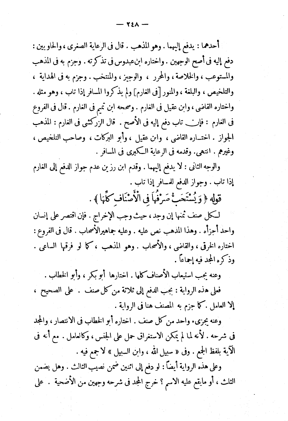 قَوْلُهُ (وَيُسْتَحَبُّ صَرْفُهَا فِي الْأَصْنَافِ كُلِّهَا) ؛ لِكُلِّ صِنْفٍ ثَمَنُهَا إنْ وُجِدَ، حَيْثُ وَجَبَ الْإِخْرَاجُ، فَإِنْ اقْتَصَرَ عَلَى إنْسَانٍ وَاحِدٍ أَجْزَأَهُ، وَهَذَا الْمَذْهَبُ نَصَّ عَلَيْهِ، وَعَلَيْهِ جَمَاهِيرُ الْأَصْحَابِ. قَالَ فِي الْفُرُوعِ: اخْتَارَهُ الْخِرَقِيُّ، وَالْقَاضِي، وَالْأَصْحَابُ. وَهُوَ الْمَذْهَبُ، كَمَا لَوْ فَرَّقَهَا السَّاعِي، وَذَكَرَهُ الْمَجْدُ فِيهِ إجْمَاعًا، وَعَنْهُ يَجِبُ اسْتِيعَابُ الْأَصْنَافِ كُلِّهَا، اخْتَارَهَا. أَبُو بَكْرٍ، وَأَبُو الْخَطَّابِ، فَعَلَى هَذِهِ الرِّوَايَةِ: يَجِبُ الدَّفْعُ إلَى ثَلَاثَةٍ مِنْ كُلِّ صِنْفٍ. عَلَى الصَّحِيحِ، إلَّا الْعَامِلَ. كَمَا جَزَمَ بِهِ الْمُصَنِّفُ هُنَا فِي الرِّوَايَةِ، وَعَنْهُ يُجْزِئُ وَاحِدٌ مِنْ كُلِّ صِنْفٍ، اخْتَارَهُ أَبُو الْخَطَّابِ فِي الِانْتِصَارِ، وَالْمَجْدُ فِي شَرْحِهِ؛ لِأَنَّهُ لَمَّا لَمْ يُمْكِنْ الِاسْتِغْرَاقُ حُمِلَ عَلَى الْجِنْسِ، وَكَالْعَامِلِ. مَعَ أَنَّهُ فِي الْآيَةِ بِلَفْظِ الْجَمْعِ، وَفِي " سَبِيلِ اللَّهِ، وَابْنِ السَّبِيلِ " لَا جَمْعَ فِيهِ، وَعَلَى هَذِهِ الرِّوَايَةِ أَيْضًا: لَوْ دَفَعَ إلَى اثْنَيْنِ ضَمِنَ نَصِيبَ الثَّالِثِ، وَهَلْ يَضْمَنُ الثُّلُثَ، أَوْ مَا يَقَعُ عَلَيْهِ الِاسْمُ؟ فَخَرَّجَ الْمَجْدُ فِي شَرْحِهِ وَجْهَيْنِ مِنْ الْأُضْحِيَّةِ. عَلَى
