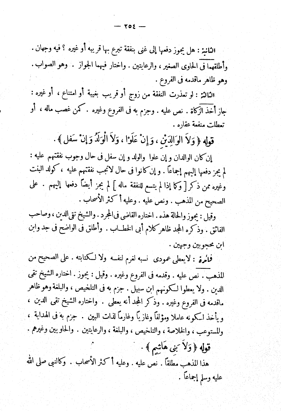 قَوْلُهُ (وَلَا بَنِي هَاشِمٍ) هَذَا الْمَذْهَبُ مُطْلَقٌ، نَصَّ عَلَيْهِ، وَعَلَيْهِ أَكْثَرُ الْأَصْحَابِ، وَكَالنَّبِيِّ - صَلَّى اللَّهُ عَلَيْهِ وَسَلَّمَ - إجْمَاعًا.
