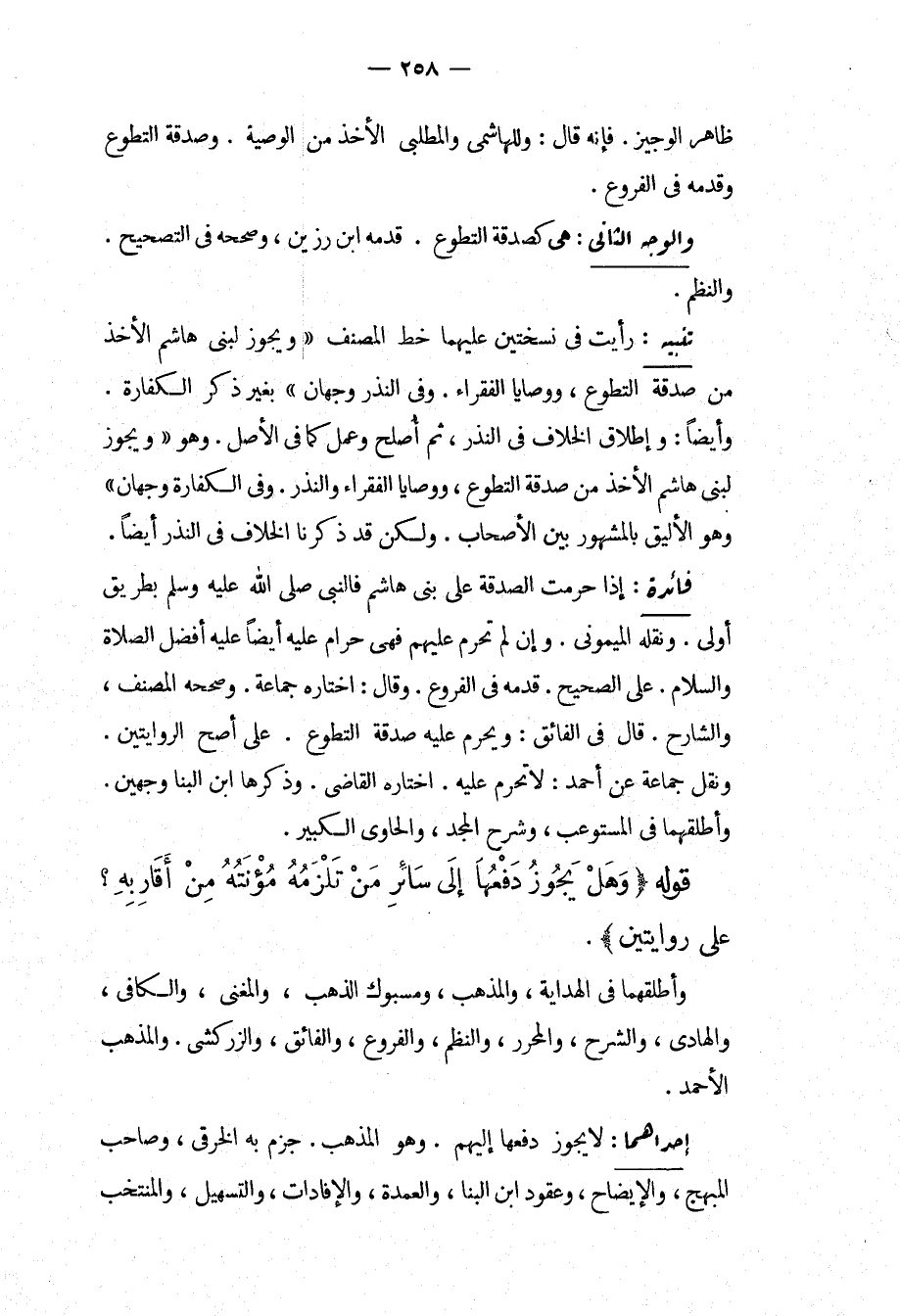 تَنْبِيهٌ: رَأَيْت فِي نُسْخَتَيْنِ عَلَيْهِمَا خَطُّ الْمُصَنِّفِ " وَيَجُوزُ لِبَنِي هَاشِمٍ الْأَخْذُ مِنْ صَدَقَةِ التَّطَوُّعِ، وَوَصَايَا الْفُقَرَاءِ، وَفِي النَّذْرِ وَجْهَانِ " بِغَيْرِ ذِكْرِ الْكَفَّارَةِ، وَأَيْضًا: وَإِطْلَاقُ الْخِلَافِ فِي النَّذْرِ، ثُمَّ أُصْلِحَ وَعُمِلَ كَمَا فِي الْأَصْلِ، وَهُوَ " وَيَجُوزُ لِبَنِي هَاشِمٍ الْأَخْذُ مِنْ صَدَقَةِ التَّطَوُّعِ، وَوَصَايَا الْفُقَرَاءِ وَالنَّذْرِ، وَفِي الْكَفَّارَةِ وَجْهَانِ " وَهُوَ الْأَلْيَقُ بِالْمَشْهُورِ بَيْنَ الْأَصْحَابِ، وَلَكِنْ قَدْ ذَكَرْنَا الْخِلَافَ فِي النَّذْرِ أَيْضًا فَائِدَةٌ: إذَا حَرُمَتْ الصَّدَقَةُ عَلَى بَنِي هَاشِمٍ فَالنَّبِيُّ - صَلَّى اللَّهُ عَلَيْهِ وَسَلَّمَ - بِطَرِيقٍ أَوْلَى، وَنَقَلَهُ الْمَيْمُونِيُّ، وَإِنْ لَمْ تَحْرُمْ عَلَيْهِمْ فَهِيَ حَرَامٌ عَلَيْهِ أَيْضًا عَلَيْهِ أَفْضَلُ الصَّلَاةِ وَالسَّلَامِ عَلَى الصَّحِيحِ. قَدَّمَهُ فِي الْفُرُوعِ، وَقَالَ: اخْتَارَهُ جَمَاعَةٌ، وَصَحَّحَهُ الْمُصَنِّفُ، وَالشَّارِحُ. قَالَ فِي الْفَائِقِ: وَيَحْرُمُ عَلَيْهِ صَدَقَةُ التَّطَوُّعِ. عَلَى أَصَحِّ الرِّوَايَتَيْنِ. وَنَقَلَ جَمَاعَةٌ عَنْ أَحْمَدَ: لَا تَحْرُمُ عَلَيْهِ، اخْتَارَهُ الْقَاضِي، وَذَكَرَهَا ابْنُ الْبَنَّا وَجْهَيْنِ. وَأَطْلَقَهُمَا فِي الْمُسْتَوْعِبِ، وَشَرْحِ الْمَجْدِ، وَالْحَاوِي الْكَبِيرِ.