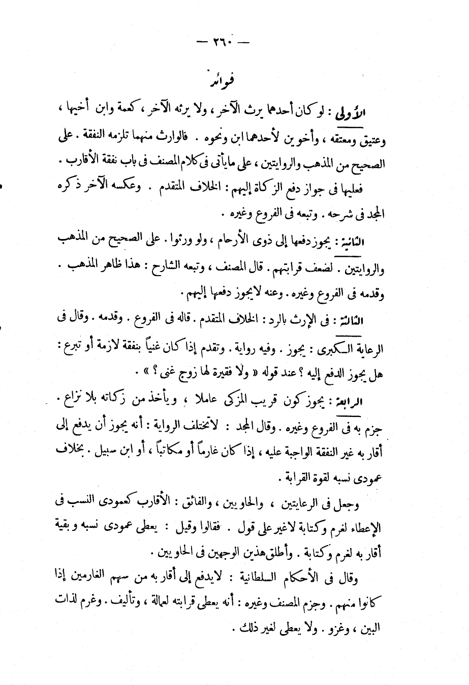 فَوَائِدُ. الْأُولَى: لَوْ كَانَ أَحَدُهُمَا يَرِثُ الْآخَرَ، وَلَا يَرِثُهُ الْآخَرُ، كَعَمَّةٍ وَابْنِ أَخِيهَا، وَعَتِيقٍ وَمُعْتِقِهِ، وَأَخَوَيْنِ لِأَحَدِهِمَا ابْنٌ وَنَحْوُهُ. فَالْوَارِثُ مِنْهُمَا تَلْزَمُهُ النَّفَقَةُ. عَلَى الصَّحِيحِ مِنْ الْمَذْهَبِ وَالرِّوَايَتَيْنِ، عَلَى مَا يَأْتِي فِي كَلَامِ الْمُصَنِّفِ فِي بَابِ نَفَقَةِ الْأَقَارِبِ، فَعَلَيْهَا فِي جَوَازِ دَفْعِ الزَّكَاةِ إلَيْهِمْ: الْخِلَافُ الْمُتَقَدِّمُ، وَعَكْسُهُ الْآخَرُ ذَكَرَهُ الْمَجْدُ فِي شَرْحِهِ، وَتَبِعَهُ فِي الْفُرُوعِ وَغَيْرِهِ.