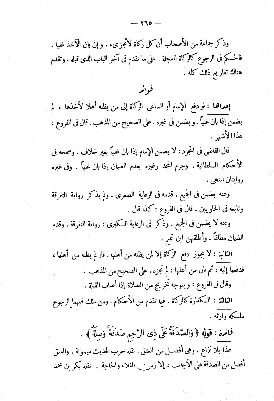 فَوَائِدُ. إحْدَاهَا: لَوْ دَفَعَ الْإِمَامُ أَوْ السَّاعِي الزَّكَاةَ إلَى مَنْ يَظُنُّهُ أَهْلًا لِأَخْذِهَا، لَمْ يَضْمَنْ إذَا بَانَ غَنِيًّا. وَيَضْمَنُ فِي غَيْرِهِ. عَلَى الصَّحِيحِ مِنْ الْمَذْهَبِ. قَالَ فِي الْفُرُوعِ: هَذَا الْأَشْهَرُ. قَالَ الْقَاضِي فِي الْمُجَرَّدِ: لَا يَضْمَنُ الْإِمَامُ إذَا بَانَ غَنِيًّا بِغَيْرِ خِلَافٍ. وَصَحَّحَهُ فِي الْأَحْكَامِ السُّلْطَانِيَّةِ، وَجَزَمَ الْمَجْدُ وَغَيْرُهُ بِعَدَمِ الضَّمَانِ إذَا بَانَ غَنِيًّا، وَفِي غَيْرِهِ رِوَايَتَانِ انْتَهَى، وَعَنْهُ يَضْمَنُ فِي الْجَمِيعِ، قَدَّمَهُ فِي الرِّعَايَةِ الصُّغْرَى، وَلَمْ يَذْكُرْ رِوَايَةَ التَّفْرِقَةِ وَتَابَعَهُ فِي الْحَاوِيَيْنِ. قَالَ فِي الْفُرُوعِ: كَذَا قَالَ، وَعَنْهُ لَا يَضْمَنُ فِي الْجَمِيعِ، وَذَكَرَ فِي الرِّعَايَةِ الْكُبْرَى: رِوَايَةَ التَّفْرِقَةِ، وَقَدَّمَ الضَّمَانَ مُطْلَقًا، وَأَطْلَقَهُنَّ ابْنُ تَمِيمٍ.