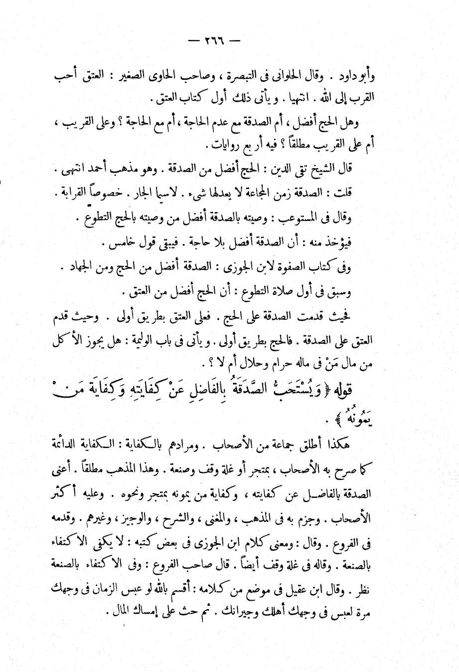 وَأَبُو دَاوُد، وَقَالَ الْحَلْوَانِيُّ فِي التَّبْصِرَةِ، وَصَاحِبُ الْحَاوِي الصَّغِيرِ: الْعِتْقُ أَحَبُّ الْقُرَبِ إلَى اللَّهِ. انْتَهَيَا. وَيَأْتِي ذَلِكَ أَوَّلَ كِتَابِ الْعِتْقِ. وَهَلْ الْحَجُّ أَفْضَلُ، أَمْ الصَّدَقَةُ مَعَ عَدَمِ الْحَاجَةِ، أَمْ مَعَ الْحَاجَةِ؟ وَعَلَى الْقَرِيبِ، أَمْ عَلَى الْقَرِيبِ مُطْلَقًا؟ فِيهِ أَرْبَعُ رِوَايَاتٍ. قَالَ الشَّيْخُ تَقِيُّ الدِّينِ: الْحَجُّ أَفْضَلُ مِنْ الصَّدَقَةِ، وَهُوَ مَذْهَبُ أَحْمَدَ. انْتَهَى. قُلْت: الصَّدَقَةُ زَمَنَ الْمَجَاعَةِ لَا يَعْدِلُهَا شَيْءٌ. لَا سِيَّمَا الْجَارُ. خُصُوصًا الْقَرَابَةَ، وَقَالَ فِي الْمُسْتَوْعِبِ: وَصِيَّتُهُ بِالصَّدَقَةِ أَفْضَلُ مِنْ وَصِيَّتِهِ بِالْحَجِّ التَّطَوُّعِ، فَيُؤْخَذُ مِنْهُ: أَنَّ الصَّدَقَةَ أَفْضَلُ بِلَا حَاجَةٍ، فَيَبْقَى قَوْلٌ خَامِسٌ، وَفِي كِتَابِ الصَّفْوَةِ لِابْنِ الْجَوْزِيِّ: الصَّدَقَةُ أَفْضَلُ مِنْ الْحَجِّ وَمِنْ الْجِهَادِ، وَسَبَقَ فِي أَوَّلِ صَلَاةِ التَّطَوُّعِ: أَنَّ الْحَجَّ أَفْضَلُ مِنْ الْعِتْقِ، فَحَيْثُ قُدِّمَتْ الصَّدَقَةُ عَلَى الْحَجِّ، فَعَلَى الْعِتْقِ بِطَرِيقِ أَوْلَى، وَحَيْثُ قُدِّمَ الْعِتْقُ عَلَى الصَّدَقَةِ، فَالْحَجُّ بِطَرِيقِ أَوْلَى. وَيَأْتِي فِي بَابِ الْوَلِيمَةِ: هَلْ يَجُوزُ الْأَكْلُ مِنْ مَالِ مَنْ فِي مَالِهِ حَرَامٌ وَحَلَالٌ أَمْ لَا؟ .