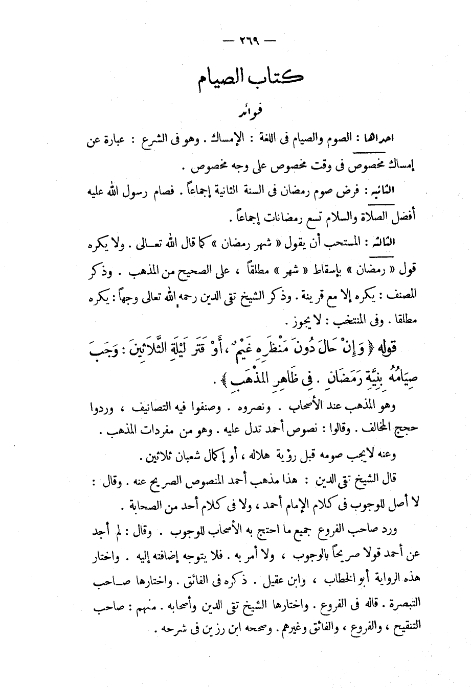 ِ فَوَائِدُ. إحْدَاهَا: الصَّوْمُ وَالصِّيَامُ فِي اللُّغَةِ: الْإِمْسَاكُ، وَهُوَ فِي الشَّرْعِ: عِبَارَةٌ عَنْ إمْسَاكٍ مَخْصُوصٍ فِي وَقْتٍ مَخْصُوصٍ عَلَى وَجْهٍ مَخْصُوصٍ. الثَّانِيَةُ: فُرِضَ صَوْمُ رَمَضَانَ فِي السَّنَةِ الثَّانِيَةِ إجْمَاعًا، فَصَامَ رَسُولُ اللَّهِ عَلَيْهِ أَفْضَلُ الصَّلَاةِ وَالسَّلَامِ تِسْعَ رَمَضَانَاتٍ إجْمَاعًا. الثَّالِثَةُ: الْمُسْتَحَبُّ أَنْ يَقُولَ " شَهْرُ رَمَضَانَ " كَمَا قَالَ اللَّهُ تَعَالَى. وَلَا يُكْرَهُ قَوْلُ " رَمَضَانَ " بِإِسْقَاطِ " شَهْرُ " مُطْلَقًا، عَلَى الصَّحِيحِ مِنْ الْمَذْهَبِ، وَذَكَرَ الْمُصَنِّفُ: يُكْرَهُ إلَّا مَعَ قَرِينَةٍ، ذَكَرَ الشَّيْخُ تَقِيُّ الدِّينِ - رَحِمَهُ اللَّهُ تَعَالَى - وَجْهًا: يُكْرَهُ مُطْلَقًا، وَفِي الْمُنْتَخَبِ: لَا يَجُوزُ.