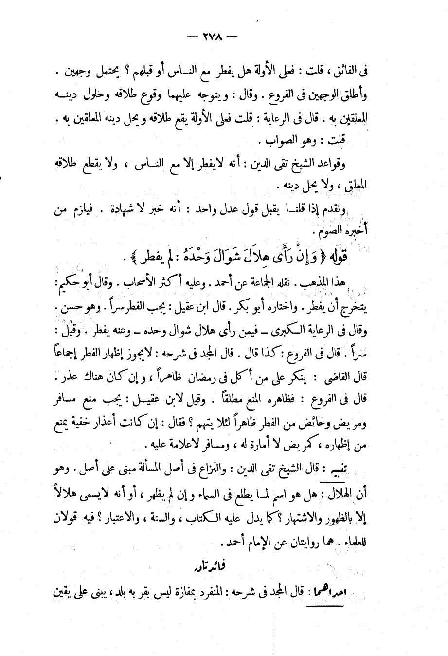 تَنْبِيهٌ: قَالَ الشَّيْخُ تَقِيُّ الدِّينِ: وَالنِّزَاعُ فِي أَصْلِ الْمَسْأَلَةِ مَبْنِيٌّ عَلَى أَصْلٍ، وَهُوَ أَنَّ الْهِلَالَ: هَلْ هُوَ اسْمٌ لِمَا طَلَعَ فِي السَّمَاءِ، وَإِنْ لَمْ يَظْهَرْ، أَوْ أَنَّهُ لَا يُسَمَّى هِلَالًا إلَّا بِالظُّهُورِ وَالِاشْتِهَارِ؟ كَمَا يَدُلُّ عَلَيْهِ الْكِتَابُ، وَالسُّنَّةُ، وَالِاعْتِبَارُ؟ فِيهِ قَوْلَانِ لِلْعُلَمَاءِ. هُمَا رِوَايَتَانِ عَنْ الْإِمَامِ أَحْمَدَ.