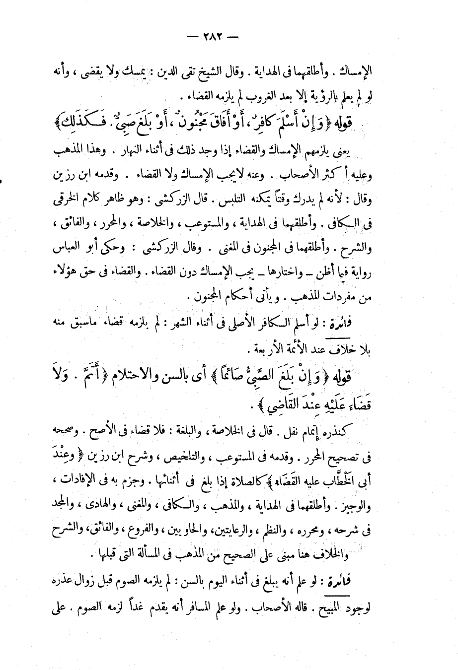 قَوْلُهُ (وَإِنْ أَسْلَمَ كَافِرٌ، أَوْ أَفَاقَ مَجْنُونٌ، أَوْ بَلَغَ صَبِيٌّ، فَكَذَلِكَ) يَعْنِي يَلْزَمُهُمْ الْإِمْسَاكُ وَالْقَضَاءُ إذَا وُجِدَ ذَلِكَ فِي أَثْنَاءِ النَّهَارِ، وَهَذَا الْمَذْهَبُ وَعَلَيْهِ أَكْثَرُ الْأَصْحَابِ. وَعَنْهُ لَا يَجِبُ الْإِمْسَاكُ وَلَا الْقَضَاءُ، وَقَدَّمَهُ ابْنُ رَزِينٍ وَقَالَ: لِأَنَّهُ لَمْ يُدْرِكْ وَقْتًا يُمْكِنُهُ التَّلَبُّسُ. قَالَ الزَّرْكَشِيُّ: وَهُوَ ظَاهِرُ كَلَامِ الْخِرَقِيِّ فِي الْكَافِي، وَأَطْلَقَهُمَا فِي الْهِدَايَةِ، وَالْمُسْتَوْعِبِ، وَالْخُلَاصَةِ، وَالْمُحَرَّرِ، وَالْفَائِقِ، وَالشَّرْحِ، وَأَطْلَقَهُمَا فِي الْمَجْنُونِ فِي الْمُغْنِي، وَقَالَ الزَّرْكَشِيُّ: وَحَكَى أَبُو الْعَبَّاسِ رِوَايَةً فِيمَا أَظُنُّ وَاخْتَارَهَا يَجِبُ الْإِمْسَاكُ دُونَ الْقَضَاءِ، وَالْقَضَاءُ فِي حَقِّ هَؤُلَاءِ مِنْ مُفْرَدَاتِ الْمَذْهَبِ، وَيَأْتِي أَحْكَامُ الْمَجْنُونِ.