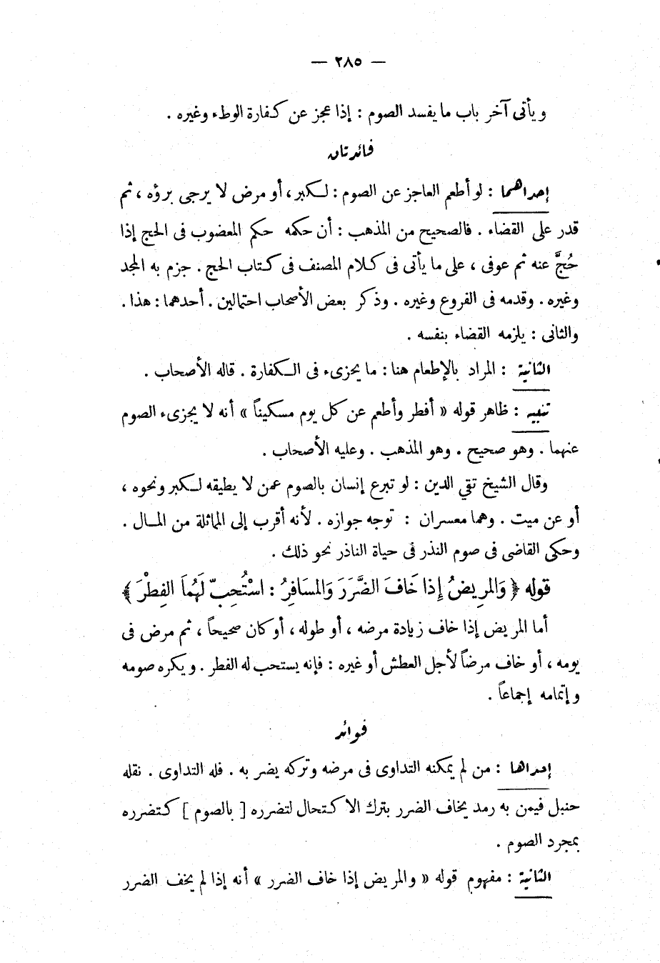 فَوَائِدُ. إحْدَاهَا: مَنْ لَمْ يُمْكِنْهُ التَّدَاوِي فِي مَرَضِهِ وَتَرْكُهُ يَضُرُّ بِهِ، فَلَهُ التَّدَاوِي. نَقَلَهُ حَنْبَلٌ فِيمَنْ بِهِ رَمَدٌ يَخَافُ الضَّرَرَ بِتَرْكِ الِاكْتِحَالِ لِتَضَرُّرِهِ [بِالصَّوْمِ] كَتَضَرُّرِهِ بِمُجَرَّدِ الصَّوْمِ