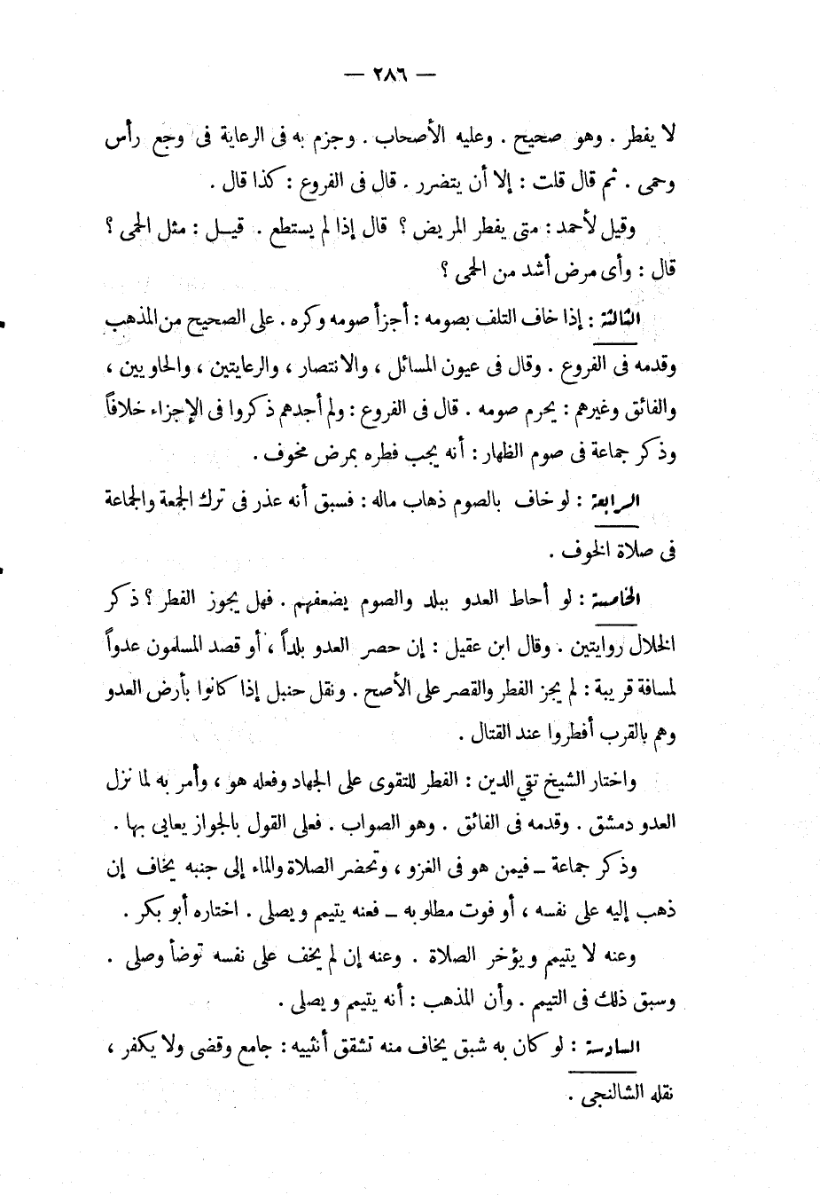 الْخَامِسَةُ: لَوْ أَحَاطَ الْعَدُوُّ بِبَلَدٍ وَالصَّوْمُ يُضْعِفُهُمْ، فَهَلْ يَجُوزُ الْفِطْرُ؟ ذَكَرَ الْخَلَّالُ رِوَايَتَيْنِ، وَقَالَ ابْنُ عَقِيلٍ: إنْ حَصَرَ الْعَدُوُّ بَلَدًا، أَوْ قَصَدَ الْمُسْلِمُونَ عَدُوًّا لِمَسَافَةٍ قَرِيبَةٍ: لَمْ يَجُزْ الْفِطْرُ وَالْقَصْرُ عَلَى الْأَصَحِّ، وَنَقَلَ حَنْبَلٌ إذَا كَانُوا بِأَرْضِ الْعَدُوِّ وَهُمْ بِالْقُرْبِ أَفْطَرُوا عِنْدَ الْقِتَالِ، وَاخْتَارَ الشَّيْخُ تَقِيُّ الدِّينِ: الْفِطْرَ لِلتَّقَوِّي عَلَى الْجِهَادِ وَفَعَلَهُ هُوَ، وَأَمَرَ بِهِ لَمَّا نَزَلَ الْعَدُوُّ دِمَشْقَ، وَقَدَّمَهُ فِي الْفَائِقِ، وَهُوَ الصَّوَابُ، فَعَلَى الْقَوْلِ بِالْجَوَازِ يُعَايَى بِهَا، وَذَكَرَ جَمَاعَةٌ فِيمَنْ هُوَ فِي الْغَزْوِ، وَتَحْضُرُ الصَّلَاةُ وَالْمَاءُ إلَى جَنْبِهِ يَخَافُ إنْ ذَهَبَ إلَيْهِ عَلَى نَفْسِهِ، أَوْ فَوْتَ مَطْلُوبِهِ فَعَنْهُ يَتَيَمَّمُ وَيُصَلِّي، اخْتَارَهُ أَبُو بَكْرٍ، وَعَنْهُ لَا يَتَيَمَّمُ وَيُؤَخِّرُ الصَّلَاةَ، وَعَنْهُ إنْ لَمْ يَخَفْ عَلَى نَفْسِهِ تَوَضَّأَ وَصَلَّى، وَسَبَقَ ذَلِكَ فِي التَّيَمُّمِ، وَأَنَّ الْمَذْهَبَ: أَنَّهُ يَتَيَمَّمُ وَيُصَلِّي.