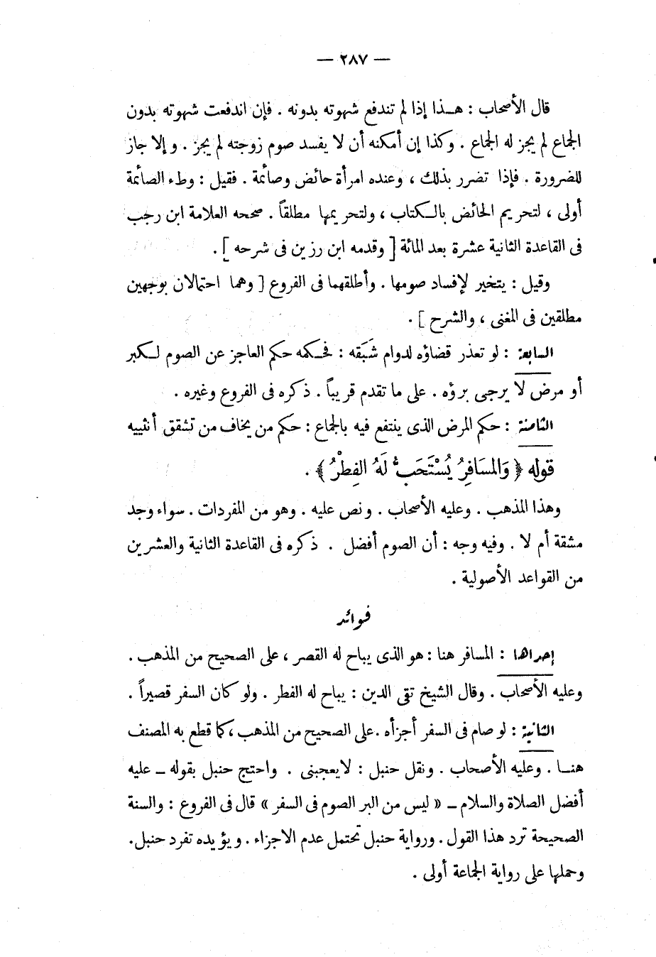 فَوَائِدُ. إحْدَاهَا: الْمُسَافِرُ هُنَا: هُوَ الَّذِي يُبَاحُ لَهُ الْقَصْرُ، عَلَى الصَّحِيحِ مِنْ الْمَذْهَبِ، وَعَلَيْهِ الْأَصْحَابُ. وَقَالَ الشَّيْخُ تَقِيُّ الدِّينِ: يُبَاحُ لَهُ الْفِطْرُ، وَلَوْ كَانَ السَّفَرُ قَصِيرًا. الثَّانِيَةُ: لَوْ صَامَ فِي السَّفَرِ أَجْزَأَهُ عَلَى الصَّحِيحِ مِنْ الْمَذْهَبِ، كَمَا قَطَعَ بِهِ الْمُصَنِّفُ هُنَا، وَعَلَيْهِ الْأَصْحَابُ، وَنَقْلُ حَنْبَلٍ: لَا يُعْجِبُنِي. وَاحْتَجَّ حَنْبَلٌ بِقَوْلِهِ عَلَيْهِ أَفْضَلُ الصَّلَاةِ وَالسَّلَامِ «لَيْسَ مِنْ الْبِرِّ الصَّوْمُ فِي السَّفَرِ» قَالَ فِي الْفُرُوعِ: وَالسُّنَّةُ الصَّحِيحَةُ تَرُدُّ هَذَا الْقَوْلَ، وَرِوَايَةُ حَنْبَلٍ تَحْتَمِلُ عَدَمَ الْإِجْزَاءِ، وَيُؤَيِّدُهُ تَفَرُّدُ حَنْبَلٍ، وَحَمْلُهَا عَلَى رِوَايَةِ الْجَمَاعَةِ أَوْلَى.