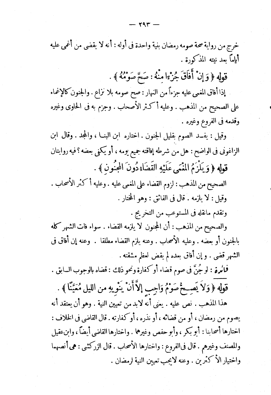 خَرَّجَ مِنْ رِوَايَةِ صِحَّةِ صَوْمِهِ رَمَضَانَ بِنِيَّةٍ وَاحِدَةٍ فِي أَوَّلِهِ: أَنَّهُ لَا يَقْضِي مَنْ أُغْمِيَ عَلَيْهِ أَيَّامًا بَعْدَ نِيَّتِهِ الْمَذْكُورَةِ. قَوْلُهُ (وَإِنْ أَفَاقَ جُزْءًا مِنْهُ: صَحَّ صَوْمُهُ) . إذَا أَفَاقَ الْمُغْمَى عَلَيْهِ جُزْءًا مِنْ النَّهَارِ: صَحَّ صَوْمُهُ بِلَا نِزَاعٍ، وَالْجُنُونُ كَالْإِغْمَاءِ عَلَى الصَّحِيحِ مِنْ الْمَذْهَبِ، وَعَلَيْهِ أَكْثَرُ الْأَصْحَابِ، وَجَزَمَ بِهِ فِي الْحَاوِي وَغَيْرِهِ وَقَدَّمَهُ فِي الْفُرُوعِ وَغَيْرِهِ، وَقِيلَ: يَفْسُدُ الصَّوْمُ بِقَلِيلِ الْجُنُونِ، اخْتَارَهُ ابْنُ الْبَنَّا، وَالْمَجْدُ، وَقَالَ ابْنُ الزَّاغُونِيِّ فِي الْوَاضِحِ: هَلْ مِنْ شَرْطِهِ إفَاقَتُهُ جَمِيعَ يَوْمِهِ، أَوْ يَكْفِي بَعْضُهُ؟ فِيهِ رِوَايَتَانِ قَوْلُهُ (وَيَلْزَمُ الْمُغْمَى عَلَيْهِ الْقَضَاءُ دُونَ الْمَجْنُونِ) ، الصَّحِيحُ مِنْ الْمَذْهَبِ: لُزُومُ الْقَضَاءِ عَلَى الْمُغْمَى عَلَيْهِ، وَعَلَيْهِ أَكْثَرُ الْأَصْحَابِ، وَقِيلَ: لَا يَلْزَمُهُ. قَالَ فِي الْفَائِقِ: وَهُوَ الْمُخْتَارُ، وَتَقَدَّمَ مَا نَقَلَهُ فِي الْمُسْتَوْعِبِ مِنْ التَّخْرِيجِ، وَالصَّحِيحُ مِنْ الْمَذْهَبِ: أَنَّ الْمَجْنُونَ لَا يَلْزَمُهُ الْقَضَاءُ. سَوَاءٌ فَاتَ الشَّهْرُ كُلُّهُ بِالْجُنُونِ أَوْ بَعْضُهُ، وَعَلَيْهِ الْأَصْحَابُ، وَعَنْهُ يَلْزَمُ الْقَضَاءُ مُطْلَقًا، وَعَنْهُ إنْ أَفَاقَ فِي الشَّهْرِ قَضَى، وَإِنْ أَفَاقَ بَعْدَهُ لَمْ يَقْضِ لِعِظَمِ مَشَقَّتِهِ.