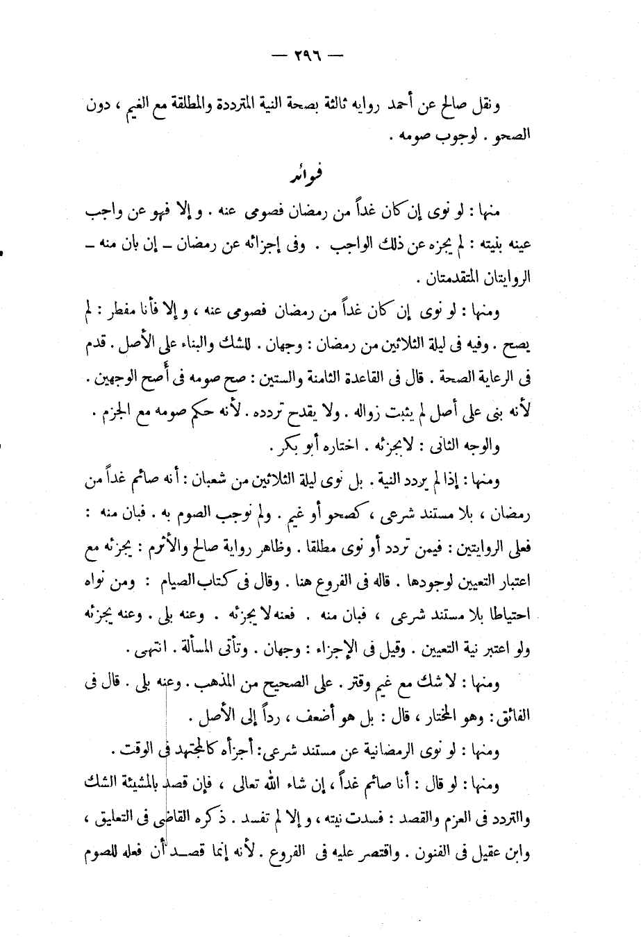 وَمِنْهَا: لَوْ نَوَى إنْ كَانَ غَدًا مِنْ رَمَضَانَ فَصَوْمِي عَنْهُ، وَإِلَّا فَأَنَا مُفْطِرٌ: لَمْ يَصِحَّ، وَفِيهِ فِي لَيْلَةِ الثَّلَاثِينَ مِنْ رَمَضَانَ: وَجْهَانِ. لِلشَّكِّ وَالْبِنَاءِ عَلَى الْأَصْلِ. قَدَّمَ فِي الرِّعَايَةِ الصِّحَّةَ. قَالَ فِي الْقَاعِدَةِ الثَّامِنَةِ وَالسِّتِّينَ: صَحَّ صَوْمُهُ فِي أَصَحِّ الْوَجْهَيْنِ؛ لِأَنَّهُ بَنَى عَلَى أَصْلٍ لَمْ يَثْبُتْ زَوَالُهُ، وَلَا يَقْدَحُ تَرَدُّدُهُ؛ لِأَنَّهُ حُكْمُ صَوْمِهِ مَعَ الْجَزْمِ، وَالْوَجْهُ الثَّانِي: لَا يُجْزِئُهُ، اخْتَارَهُ أَبُو بَكْرٍ.