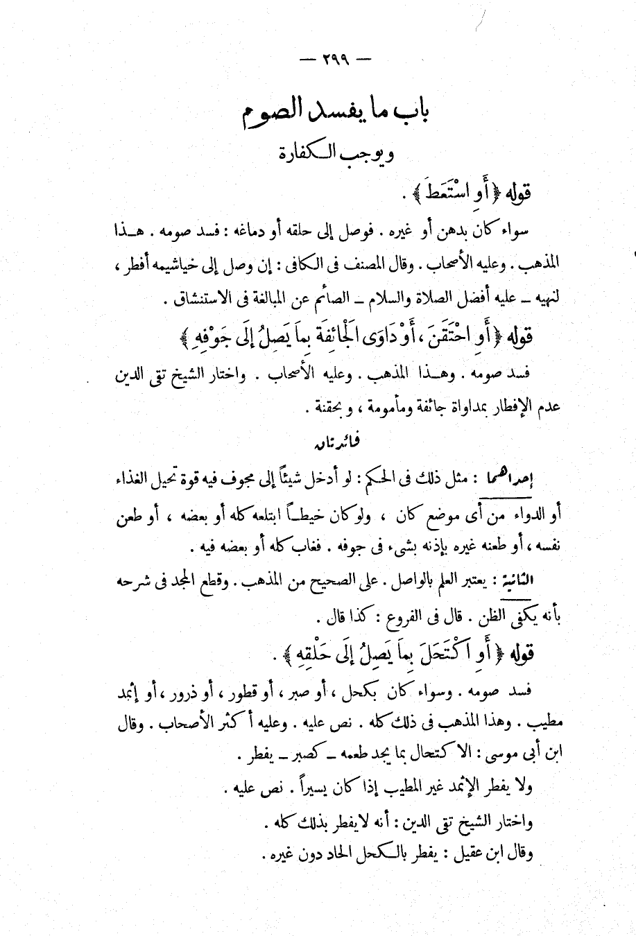 قَوْلُهُ (أَوْ اكْتَحَلَ بِمَا يَصِلُ إلَى حَلْقِهِ) ، فَسَدَ صَوْمُهُ، وَسَوَاءٌ كَانَ بِكُحْلٍ، أَوْ صَبِرٍ، أَوْ قُطُورٍ، أَوْ ذَرُورٍ، أَوْ إثْمِدٍ مُطَيَّبٍ، وَهَذَا الْمَذْهَبُ فِي ذَلِكَ كُلِّهِ، نَصَّ عَلَيْهِ، وَعَلَيْهِ أَكْثَرُ الْأَصْحَابِ. وَقَالَ ابْنُ أَبِي مُوسَى: الِاكْتِحَالُ بِمَا يَجِدُ طَعْمَهُ كَصَبِرٍ يُفْطِرُ، وَلَا يُفْطِرُ الْإِثْمِدُ غَيْرُ الْمُطَيِّبِ إذَا كَانَ يَسِيرًا، نَصَّ عَلَيْهِ، وَاخْتَارَ الشَّيْخُ تَقِيُّ الدِّينِ: أَنَّهُ لَا يُفْطِرُ بِذَلِكَ كُلِّهِ، وَقَالَ ابْنُ عَقِيلٍ: يُفْطِرُ بِالْكُحْلِ الْحَادِّ دُونَ غَيْرِهِ.