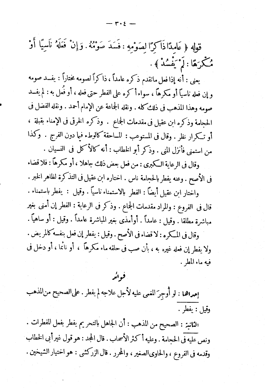 فَوَائِدُ. إحْدَاهَا: لَوْ أُوجِرَ الْمُغْمَى عَلَيْهِ لِأَجْلِ عِلَاجِهِ لَمْ يُفْطِرْ عَلَى الصَّحِيحِ مِنْ الْمَذْهَبِ وَقِيلَ: يُفْطِرُ. الثَّانِيَةُ: الصَّحِيحُ مِنْ الْمَذْهَبِ: أَنَّ الْجَاهِلَ بِالتَّحْرِيمِ يُفْطِرُ بِفِعْلِ الْمُفْطِرَاتِ وَنَصَّ عَلَيْهِ فِي الْحِجَامَةِ وَعَلَيْهِ أَكْثَرُ الْأَصْحَابِ. قَالَ الْمَجْدُ: هُوَ قَوْلُ غَيْرِ أَبِي الْخَطَّابِ وَقَدَّمَهُ فِي الْفُرُوعِ، وَالْحَاوِي الصَّغِيرِ وَالْمُحَرَّرِ قَالَ الزَّرْكَشِيُّ: هُوَ اخْتِيَارُ الشَّيْخَيْنِ.