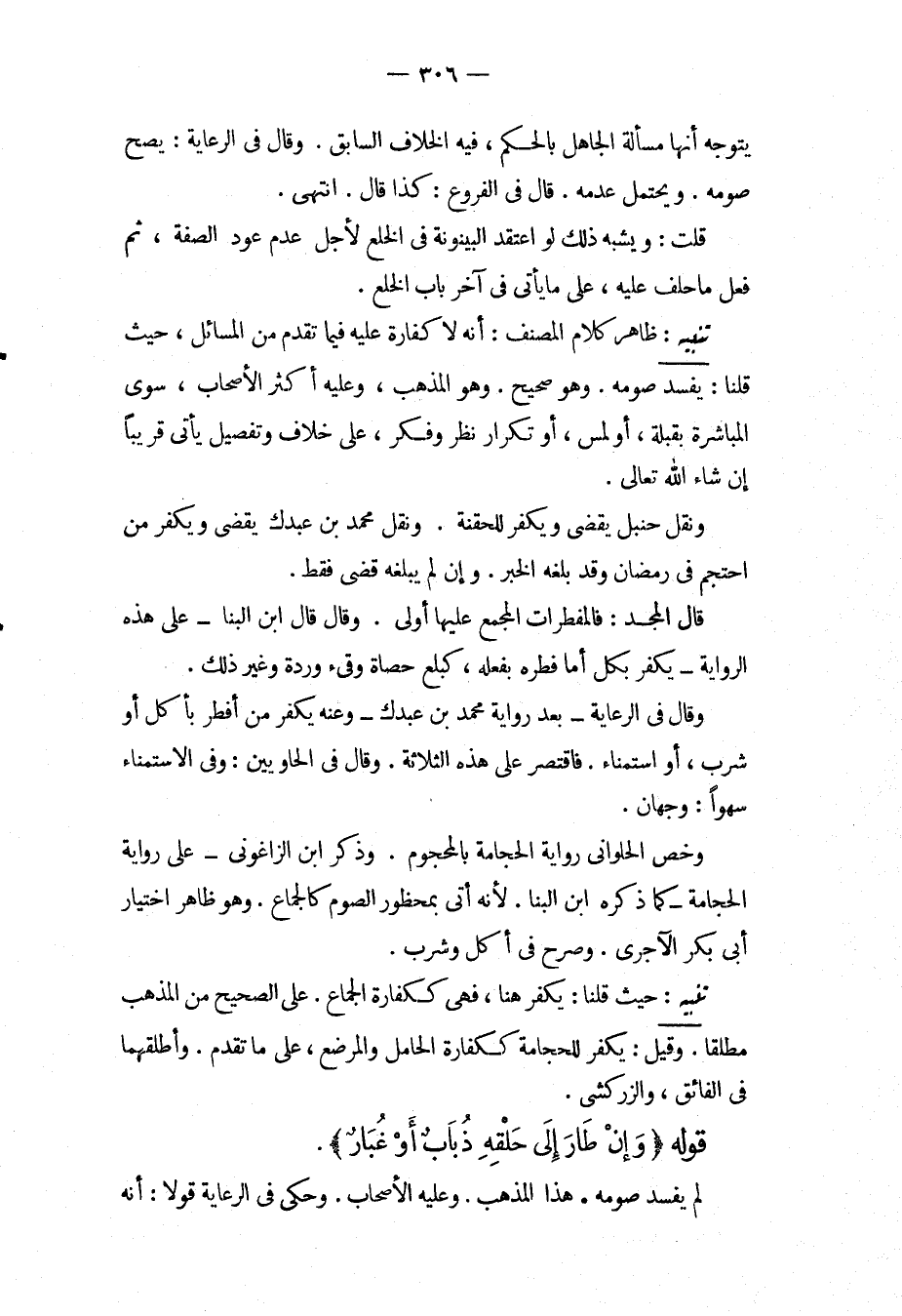 يَتَوَجَّهُ أَنَّهَا مَسْأَلَةُ الْجَاهِلِ بِالْحُكْمِ، فِيهِ الْخِلَافُ السَّابِقُ، وَقَالَ فِي الرِّعَايَةِ: يَصِحُّ صَوْمُهُ. وَيَحْتَمِلُ عَدَمَهُ. قَالَ فِي الْفُرُوعِ: كَذَا قَالَ. انْتَهَى. قُلْت: وَيُشْبِهُ ذَلِكَ لَوْ اعْتَقَدَ الْبَيْنُونَةَ فِي الْخُلْعِ لِأَجْلِ عَدَمِ عَوْدِ الصِّفَةِ، ثُمَّ فَعَلَ مَا حَلَفَ عَلَيْهِ، عَلَى مَا يَأْتِي فِي آخِرِ بَابِ الْخُلْعِ.