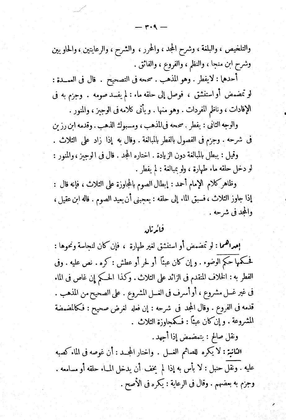 وَالتَّلْخِيصِ، وَالْبُلْغَةِ، وَشَرْحِ الْمَجْدِ، وَالْمُحَرَّرِ، وَالشَّرْحِ، وَالرِّعَايَتَيْنِ، وَالْحَاوِيَيْنِ وَشَرْحِ ابْنِ مُنَجَّى، وَالنَّظْمِ، وَالْفُرُوعِ، وَالْفَائِقِ. أَحَدُهُمَا: لَا يُفْطِرُ، وَهُوَ الْمَذْهَبُ، صَحَّحَهُ فِي التَّصْحِيحِ. قَالَ فِي الْعُمْدَةِ: لَوْ تَمَضْمَضَ أَوْ اسْتَنْشَقَ، فَوَصَلَ إلَى حَلْقِهِ مَاءٌ: لَمْ يَفْسُدْ صَوْمُهُ، وَجَزَمَ بِهِ فِي الْإِفَادَاتِ، وَنَاظِمِ الْمُفْرَدَاتِ، وَهُوَ مِنْهَا، وَيَأْتِي كَلَامُهُ فِي الْوَجِيزِ، وَالْمُنَوِّرِ، وَالْوَجْهُ الثَّانِي: يُفْطِرُ صَحَّحَهُ فِي الْمَذْهَبِ، وَمَسْبُوكِ الذَّهَبِ، وَقَدَّمَهُ ابْنُ رَزِينٍ فِي شَرْحِهِ. وَجَزَمَ فِي الْفُصُولِ بِالْفِطْرِ بِالْمُبَالَغَةِ، وَقَالَ بِهِ إذَا زَادَ عَلَى الثَّلَاثِ، وَقِيلَ: يَبْطُلُ بِالْمُبَالَغَةِ دُونَ الزِّيَادَةِ، اخْتَارَهُ الْمَجْدُ. قَالَ فِي الْوَجِيزِ، وَالْمُنَوِّرِ: لَوْ دَخَلَ حَلْقَهُ مَاءُ طَهَارَةٍ، وَلَوْ بِمُبَالَغَةٍ: لَمْ يُفْطِرْ، وَظَاهِرُهُ كَلَامُ الْإِمَامِ أَحْمَدَ: إبْطَالُ الصَّوْمِ بِالْمُجَاوَزَةِ عَلَى الثَّلَاثِ، فَإِنَّهُ قَالَ: إذَا جَاوَزَتْ الثَّلَاثَ، فَسَبَقَ الْمَاءُ إلَى حَلْقِهِ: يُعْجِبُنِي أَنْ يُعِيدَ الصَّوْمَ. قَالَهُ ابْنُ عَقِيلٍ، وَالْمَجْدُ فِي شَرْحِهِ.