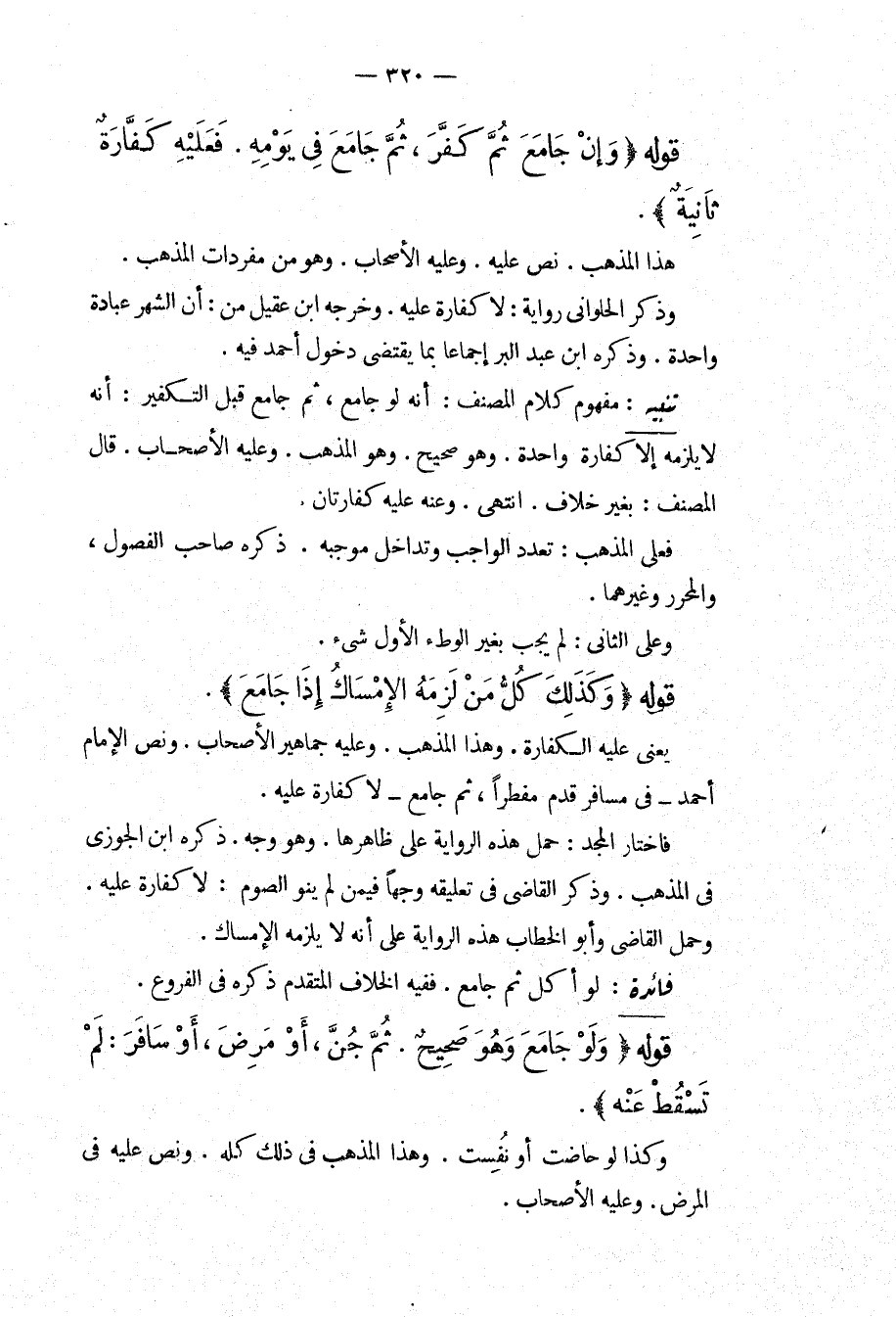 تَنْبِيهٌ: مَفْهُومُ كَلَامِ الْمُصَنِّفِ: أَنَّهُ لَوْ جَامَعَ، ثُمَّ جَامَعَ قَبْلَ التَّكْفِيرِ: أَنَّهُ لَا يَلْزَمُهُ إلَّا كَفَّارَةٌ وَاحِدَةٌ، وَهُوَ صَحِيحٌ، وَهُوَ الْمَذْهَبُ، وَعَلَيْهِ الْأَصْحَابُ. قَالَ الْمُصَنِّفُ: بِغَيْرِ خِلَافٍ. انْتَهَى. وَعَنْهُ عَلَيْهِ كَفَّارَتَانِ، فَعَلَى الْمَذْهَبِ: تَعَدَّدَ الْوَاجِبُ وَتَدَاخَلَ مُوجِبُهُ. ذَكَرَهُ صَاحِبُ الْفُصُولِ، وَالْمُحَرَّرِ وَغَيْرِهِمَا، وَعَلَى الثَّانِي: لَمْ يَجِبْ بِغَيْرِ الْوَطْءِ الْأَوَّلِ شَيْءٌ. قَوْلُهُ (وَكَذَلِكَ كُلُّ مَنْ لَزِمَهُ الْإِمْسَاكُ إذَا جَامَعَ) . يَعْنِي عَلَيْهِ الْكَفَّارَةُ، وَهَذَا الْمَذْهَبُ، وَعَلَيْهِ جَمَاهِيرُ الْأَصْحَابِ، وَنَصُّ الْإِمَامِ أَحْمَدَ فِي مُسَافِرٍ قَدِمَ مُفْطِرًا، ثُمَّ جَامَعَ لَا كَفَّارَةَ عَلَيْهِ، فَاخْتَارَ الْمَجْدُ: حَمْلَ هَذِهِ الرِّوَايَةِ عَلَى ظَاهِرِهَا، وَهُوَ وَجْهٌ ذَكَرَهُ ابْنُ الْجَوْزِيِّ فِي الْمُذْهَبِ، وَذَكَرَ الْقَاضِي فِي تَعْلِيقِهِ وَجْهًا فِيمَنْ لَمْ يَنْوِ الصَّوْمَ: لَا كَفَّارَةَ عَلَيْهِ، وَحَمَلَ الْقَاضِي وَأَبُو الْخَطَّابِ هَذِهِ الرِّوَايَةَ عَلَى أَنَّهُ لَا يَلْزَمُهُ الْإِمْسَاكُ، فَائِدَةٌ: لَوْ أَكَلَ ثُمَّ جَامَعَ، فَفِيهِ الْخِلَافُ الْمُتَقَدِّمُ ذِكْرُهُ فِي الْفُرُوعِ.