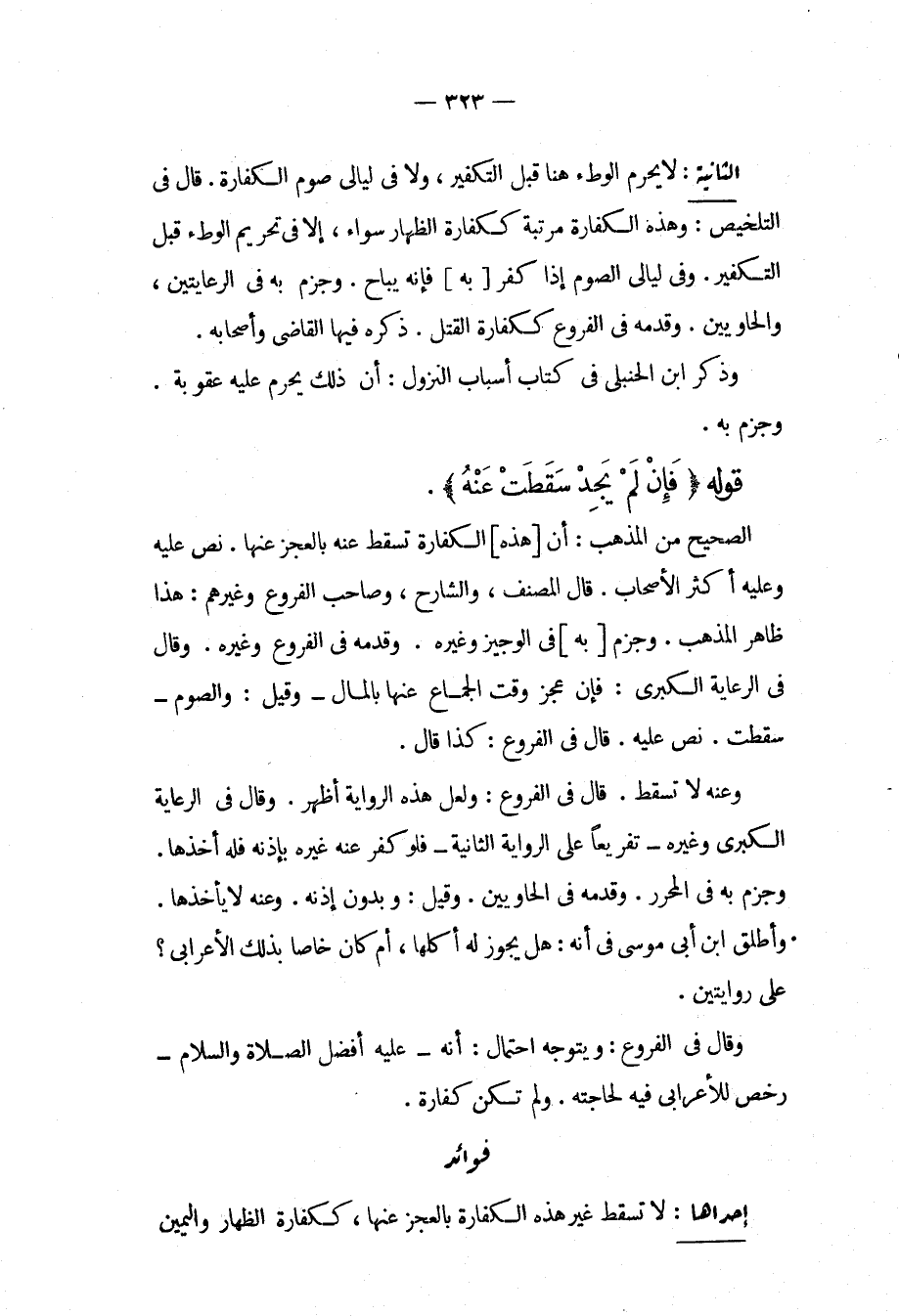 فَوَائِدُ. إحْدَاهَا: لَا تَسْقُطُ غَيْرُ هَذِهِ الْكَفَّارَةِ بِالْعَجْزِ عَنْهَا، كَكَفَّارَةِ الظِّهَارِ وَالْيَمِينِ