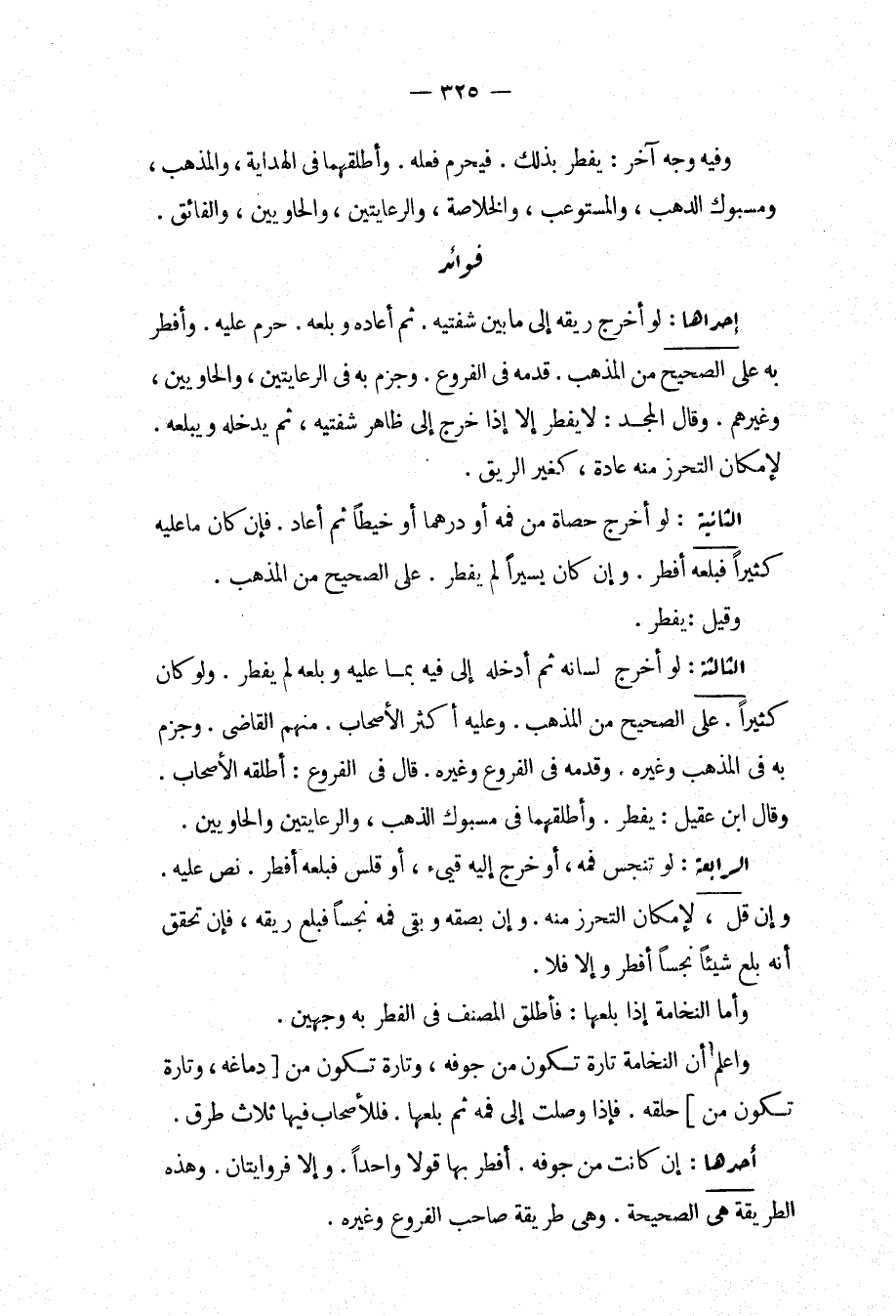 فَوَائِدُ إحْدَاهَا: لَوْ أَخْرَجَ رِيقَهُ إلَى مَا بَيْنَ شَفَتَيْهِ. ثُمَّ أَعَادَهُ وَبَلَعَهُ. حَرُمَ عَلَيْهِ، وَأَفْطَرَ بِهِ عَلَى الصَّحِيحِ مِنْ الْمَذْهَبِ، قَدَّمَهُ فِي الْفُرُوعِ، وَجَزَمَ بِهِ فِي الرِّعَايَتَيْنِ، وَالْحَاوِيَيْنِ، وَغَيْرِهِمْ، وَقَالَ الْمَجْدُ: لَا يُفْطِرُ إلَّا إذَا خَرَجَ إلَى ظَاهِرِ شَفَتَيْهِ، ثُمَّ يُدْخِلُهُ وَيَبْلَعُهُ؛ لِإِمْكَانِ التَّحَرُّزِ مِنْهُ عَادَةً، كَغَيْرِ الرِّيقِ.