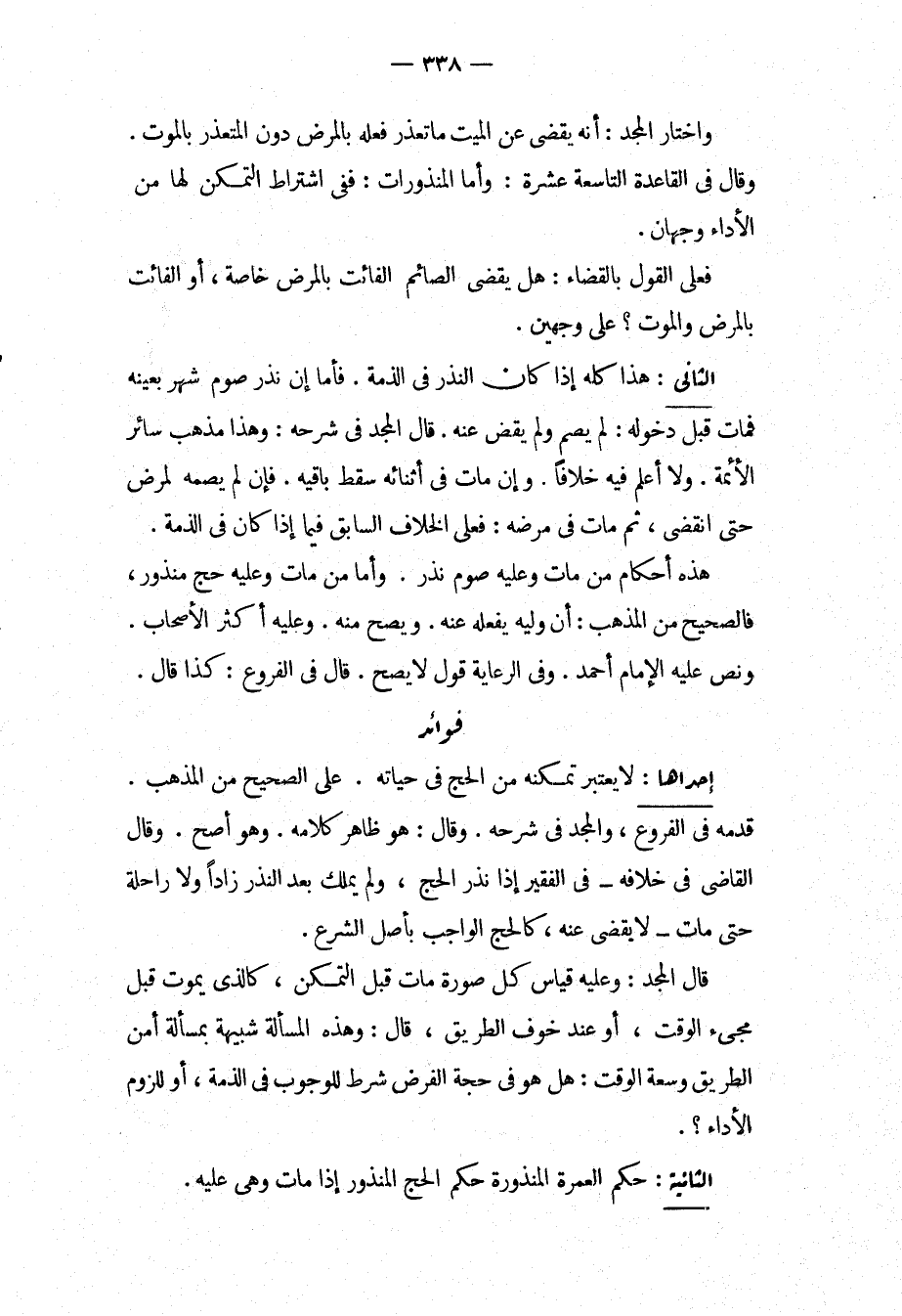 فَوَائِدُ. إحْدَاهَا: لَا يُعْتَبَرُ تَمَكُّنُهُ مِنْ الْحَجِّ فِي حَيَاتِهِ عَلَى الصَّحِيحِ مِنْ الْمَذْهَبِ، قَدَّمَهُ فِي الْفُرُوعِ، وَالْمَجْدُ فِي شَرْحِهِ، وَقَالَ: هُوَ ظَاهِرُ كَلَامِهِ. وَهُوَ أَصَحُّ، وَقَالَ الْقَاضِي فِي خِلَافِهِ فِي الْفَقِيرِ إذَا نَذَرَ الْحَجَّ، وَلَمْ يَمْلِكْ بَعْدَ النَّذْرِ زَادًا وَلَا رَاحِلَةً حَتَّى مَاتَ لَا يُقْضَى عَنْهُ، كَالْحَجِّ الْوَاجِبِ بِأَصْلِ الشَّرْعِ، قَالَ الْمَجْدُ: وَعَلَيْهِ قِيَاسُ كُلِّ صُورَةٍ مَاتَ قَبْلَ التَّمَكُّنِ، كَاَلَّذِي يَمُوتُ قَبْلَ مَجِيءِ الْوَقْتِ، أَوْ عِنْدَ خَوْفِ الطَّرِيقِ، قَالَ: وَهَذِهِ الْمَسْأَلَةُ شَبِيهَةٌ بِمَسْأَلَةِ أَمْنِ الطَّرِيقِ وَسَعَةِ الْوَقْتِ: هَلْ هُوَ فِي حَجَّةِ الْفَرْضِ شَرْطٌ لِلْوُجُوبِ فِي الذِّمَّةِ، أَوْ لِلُزُومِ الْأَدَاءِ؟ . الثَّانِيَةُ: حُكْمُ الْعُمْرَةِ الْمَنْذُورَةِ حُكْمُ الْحَجِّ الْمَنْذُورِ إذَا مَاتَ وَهِيَ عَلَيْهِ.