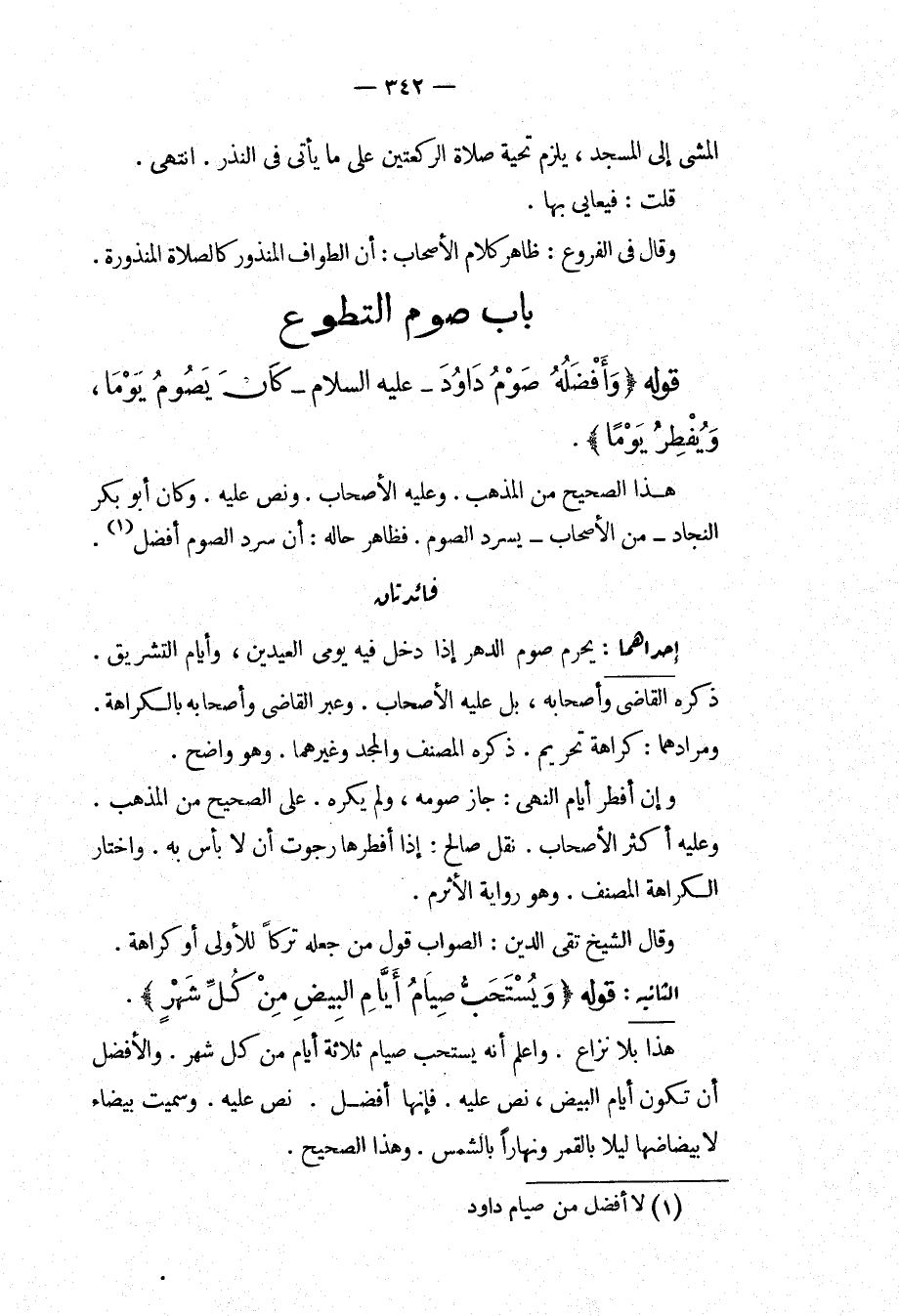 ِ قَوْلُهُ (وَأَفْضَلُهُ صَوْمُ دَاوُد - عَلَيْهِ السَّلَامُ - كَانَ يَصُومُ يَوْمًا، وَيُفْطِرُ يَوْمًا) هَذَا الصَّحِيحُ مِنْ الْمَذْهَبِ، وَعَلَيْهِ الْأَصْحَابُ، وَنَصَّ عَلَيْهِ. وَكَانَ أَبُو بَكْرٍ النَّجَّادُ مِنْ الْأَصْحَابِ يَسْرُدُ الصَّوْمَ، فَظَاهِرُ حَالِهِ: أَنَّ سَرْدَ الصَّوْمِ أَفْضَلُ.