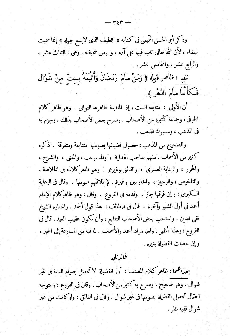 تَنْبِيهٌ: ظَاهِرُ قَوْلِهِ (وَمَنْ صَامَ رَمَضَانَ وَأَتْبَعَهُ بِسِتٍّ مِنْ شَوَّالٍ فَكَأَنَّمَا صَامَ الدَّهْرَ) . أَنَّ الْأَوْلَى: مُتَابَعَةُ السِّتِّ، إذْ الْمُتَابَعَةُ ظَاهِرُهَا التَّوَالِي، وَهُوَ ظَاهِرُ كَلَامِ الْخِرَقِيِّ، وَجَمَاعَةٍ كَثِيرَةٍ مِنْ الْأَصْحَابِ: وَصَرَّحَ بَعْضُ الْأَصْحَابِ بِذَلِكَ، وَجَزَمَ بِهِ فِي الْمُذْهَبِ، وَمَسْبُوكِ الذَّهَبِ، وَالصَّحِيحُ مِنْ الْمَذْهَبِ: حُصُولُ فَضِيلَتِهَا بِصَوْمِهَا مُتَتَابِعَةً وَمُتَفَرِّقَةً. ذَكَرَهُ كَثِيرٌ مِنْ الْأَصْحَابِ. مِنْهُمْ صَاحِبُ الْهِدَايَةِ، وَالْمُسْتَوْعِبُ، وَالْمُغْنِي، وَالشَّرْحُ، وَالْمُحَرَّرُ، وَالرِّعَايَةُ الصُّغْرَى، وَالْفَائِقُ وَغَيْرُهُمْ. هُوَ ظَاهِرُ كَلَامِهِ فِي الْخُلَاصَةِ، وَالتَّلْخِيصِ، وَالْوَجِيزِ، وَالْحَاوِيَيْنِ وَغَيْرِهِمْ؛ لِإِطْلَاقِهِمْ صَوْمًا، وَقَالَ فِي الرِّعَايَةِ الْكُبْرَى: وَإِنْ فَرَّقَهَا جَازَ، وَقَدَّمَهُ فِي الْفُرُوعِ، وَقَالَ: وَهُوَ ظَاهِرُ كَلَامِ الْإِمَامِ أَحْمَدَ فِي أَوَّلِ الشَّهْرِ وَآخِرِهِ. قَالَ فِي اللَّطَائِفِ: هَذَا قَوْلُ أَحْمَدَ، وَاخْتَارَهُ الشَّيْخُ تَقِيُّ الدِّينِ، وَاسْتَحَبَّ بَعْضُ الْأَصْحَابِ التَّتَابُعَ، وَأَنْ يَكُونَ عَقِيبَ الْعِيدِ، قَالَ فِي الْفُرُوعِ: وَهَذَا أَظْهَرُ، وَلَعَلَّهُ مُرَادُ أَحْمَدَ وَالْأَصْحَابِ؛ لِمَا فِيهِ مِنْ الْمُسَارَعَةِ إلَى الْخَيْرِ، وَإِنْ حَصَلَتْ الْفَضِيلَةُ بِغَيْرِهِ، فَائِدَتَانِ. إحْدَاهُمَا: ظَاهِرُ كَلَامِ الْمُصَنِّفِ: أَنَّ الْفَضِيلَةَ لَا تَحْصُلُ بِصِيَامِ السِّتَّةِ فِي غَيْرِ شَوَّالٍ، وَهُوَ صَحِيحٌ، وَصَرَّحَ بِهِ كَثِيرٌ مِنْ الْأَصْحَابِ. وَقَالَ فِي الْفُرُوعِ: وَيَتَوَجَّهُ احْتِمَالٌ تَحْصُلُ الْفَضِيلَةُ بِصَوْمِهَا فِي غَيْرِ شَوَّالٍ، وَقَالَ فِي الْفَائِقِ: وَلَوْ كَانَتْ مِنْ غَيْرِ شَوَّالٍ فَفِيهِ نَظَرٌ.