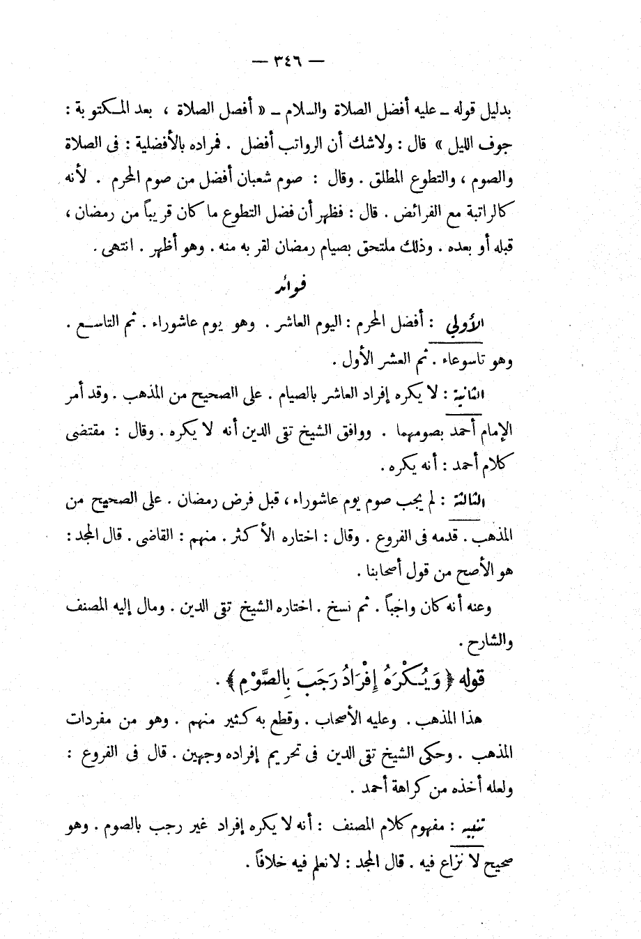 الثَّانِيَةُ: لَا يُكْرَهُ إفْرَادُ الْعَاشِرِ بِالصِّيَامِ عَلَى الصَّحِيحِ مِنْ الْمَذْهَبِ، وَقَدْ أَمَرَ الْإِمَامُ أَحْمَدُ بِصَوْمِهَا، وَوَافَقَ الشَّيْخُ تَقِيُّ الدِّينِ أَنَّهُ لَا يُكْرَهُ، وَقَالَ: مُقْتَضَى كَلَامِ أَحْمَدَ: أَنَّهُ يُكْرَهُ. الثَّالِثَةُ: لَمْ يَجِبْ صَوْمُ يَوْمِ عَاشُورَاءَ، قَبْلَ فَرْضِ رَمَضَانَ عَلَى الصَّحِيحِ مِنْ الْمَذْهَبِ، قَدَّمَهُ فِي الْفُرُوعِ، وَقَالَ: اخْتَارَهُ الْأَكْثَرُ. مِنْهُمْ: الْقَاضِي. قَالَ الْمَجْدُ: هُوَ الْأَصَحُّ مِنْ قَوْلِ أَصْحَابِنَا، وَعَنْهُ أَنَّهُ كَانَ وَاجِبًا. ثُمَّ نُسِخَ، اخْتَارَهُ الشَّيْخُ تَقِيُّ الدِّينِ، وَمَالَ إلَيْهِ الْمُصَنِّفُ وَالشَّارِحُ.