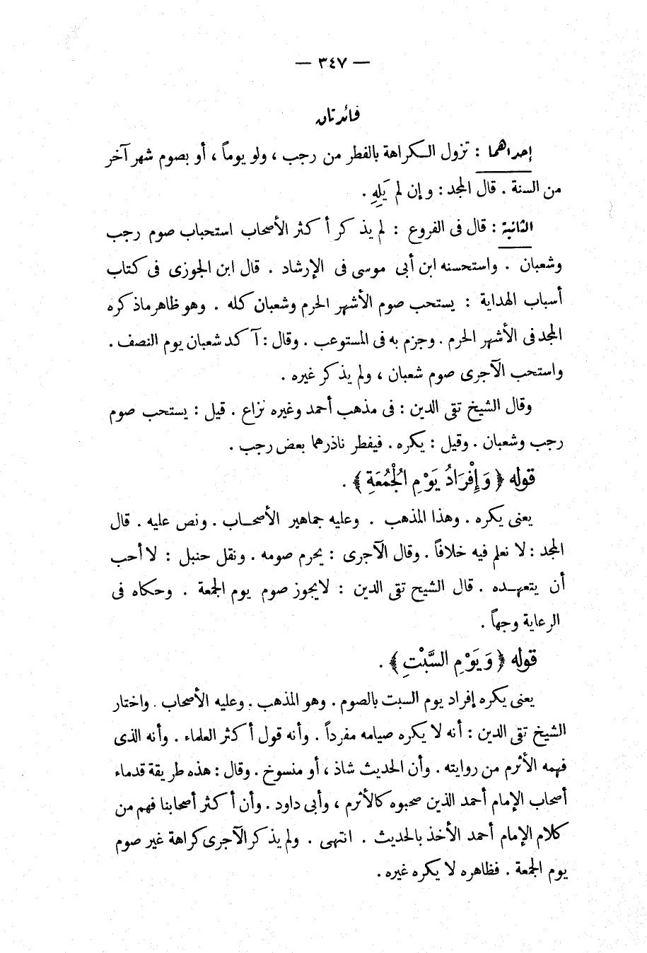 قَوْلُهُ (وَيَوْمِ السَّبْتِ) . يَعْنِي يُكْرَهُ إفْرَادُ يَوْمِ السَّبْتِ بِالصَّوْمِ، وَهُوَ الْمَذْهَبُ، وَعَلَيْهِ الْأَصْحَابُ، وَاخْتَارَ الشَّيْخُ تَقِيُّ الدِّينِ: أَنَّهُ لَا يُكْرَهُ صِيَامُهُ مُفْرَدًا، وَأَنَّهُ قَوْلُ أَكْثَرِ الْعُلَمَاءِ، وَأَنَّهُ الَّذِي فَهِمَهُ الْأَثْرَمُ مِنْ رِوَايَتِهِ، وَأَنَّ الْحَدِيثَ شَاذٌّ، أَوْ مَنْسُوخٌ، وَقَالَ: هَذِهِ طَرِيقَةُ قُدَمَاءِ أَصْحَابِ الْإِمَامِ أَحْمَدَ الَّذِينَ صَحِبُوهُ كَالْأَثْرَمِ، وَأَبِي دَاوُد، وَأَنَّ أَكْثَرَ أَصْحَابِنَا فَهِمَ مِنْ كَلَامِ الْإِمَامِ أَحْمَدَ الْأَخْذَ بِالْحَدِيثِ. انْتَهَى. وَلَمْ يَذْكُرْ الْآجُرِّيُّ كَرَاهَةً غَيْرَ صَوْمِ يَوْمِ الْجُمُعَةِ، فَظَاهِرُهُ لَا يُكْرَهُ غَيْرُهُ.