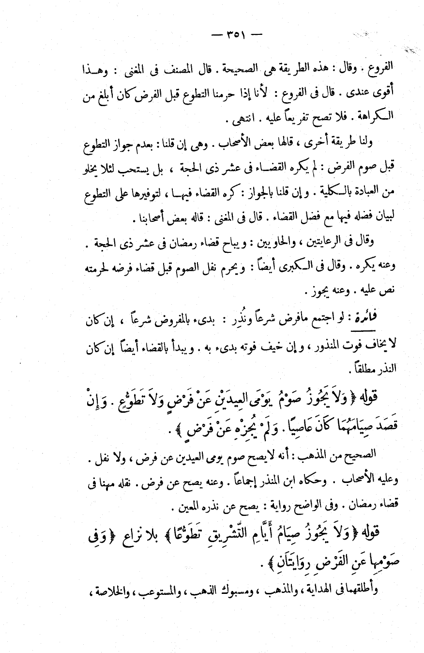 وَلَنَا طَرِيقَةٌ أُخْرَى، قَالَهَا بَعْضُ الْأَصْحَابِ، وَهِيَ إنْ قُلْنَا: بِعَدَمِ جَوَازِ التَّطَوُّعِ قَبْلَ صَوْمِ الْفَرْضِ: لَمْ يُكْرَهْ الْقَضَاءُ فِي عَشْرِ ذِي الْحِجَّةِ، بَلْ يُسْتَحَبُّ لِئَلَّا يَخْلُوَ مِنْ الْعِبَادَةِ بِالْكُلِّيَّةِ، وَإِنْ قُلْنَا بِالْجَوَازِ: كُرِهَ الْقَضَاءُ فِيهَا، لِتَوْفِيرِهَا عَلَى التَّطَوُّعِ لِبَيَانِ فَضْلِهِ فِيهَا مَعَ فَضْلِ الْقَضَاءِ. قَالَ فِي الْمُغْنِي: قَالَهُ بَعْضُ أَصْحَابِنَا، وَقَالَ فِي الرِّعَايَتَيْنِ، وَالْحَاوِيَيْنِ: وَيُبَاحُ قَضَاءُ رَمَضَانَ فِي عَشْرِ ذِي الْحِجَّةِ، وَعَنْهُ يُكْرَهُ، وَقَالَ فِي الْكُبْرَى أَيْضًا: وَيَحْرُمُ نَفْلُ الصَّوْمِ قَبْلَ قَضَاءِ فَرْضِهِ لِحُرْمَتِهِ نَصَّ عَلَيْهِ، وَعَنْهُ يَجُوزُ.