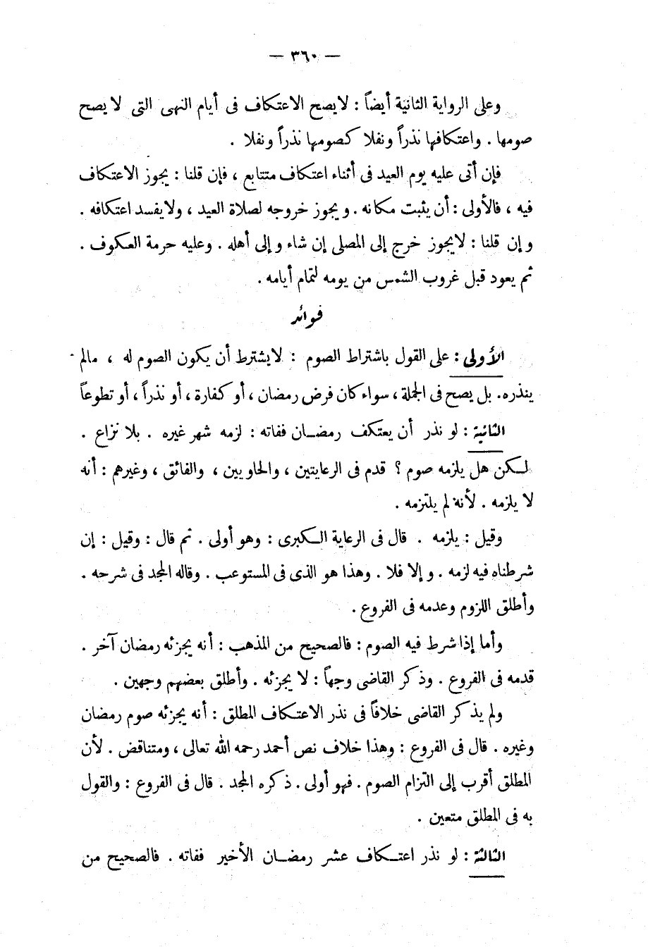وَعَلَى الرِّوَايَةِ الثَّانِيَةِ أَيْضًا: لَا يَصِحُّ الِاعْتِكَافُ فِي أَيَّامِ النَّهْيِ الَّتِي لَا يَصِحُّ صَوْمُهَا، وَاعْتِكَافُهَا نَذْرًا وَنَفْلًا كَصَوْمِهَا نَذْرًا وَنَفْلًا، فَإِنْ أَتَى عَلَيْهِ يَوْمُ الْعِيدِ فِي أَثْنَاءِ اعْتِكَافٍ مُتَتَابِعٍ، فَإِنْ قُلْنَا: يَجُوزُ الِاعْتِكَافُ فِيهِ، فَالْأَوْلَى: أَنْ يَثْبُتَ مَكَانَهُ، وَيَجُوزُ خُرُوجُهُ لِصَلَاةِ الْعِيدِ، وَلَا يَفْسُدُ اعْتِكَافُهُ، وَإِنْ قُلْنَا: لَا يَجُوزُ خَرَجَ إلَى الْمُصَلَّى إنْ شَاءَ وَإِلَى أَهْلِهِ، وَعَلَيْهِ حُرْمَةُ الْعُكُوفِ. ثُمَّ يَعُودُ قَبْلَ غُرُوبِ الشَّمْسِ مِنْ يَوْمِهِ لِتَمَامِ أَيَّامِهِ.