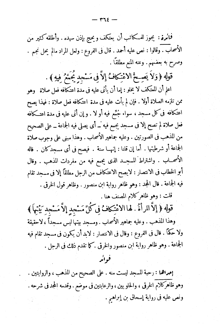فَائِدَةٌ: يَجُوزُ لِلْمُكَاتَبِ أَنْ يَعْتَكِفَ وَيَحُجَّ بِإِذْنِ سَيِّدِهِ، وَأَطْلَقَهُ كَثِيرٌ مِنْ الْأَصْحَابِ، وَقَالُوا: نَصَّ عَلَيْهِ أَحْمَدُ. قَالَ فِي الْفُرُوعِ: وَلَعَلَّ الْمُرَادَ مَا لَمْ يَحِلَّ نَجْمٌ، وَصَرَّحَ بِهِ بَعْضُهُمْ، وَعَنْهُ الْمَنْعُ مُطْلَقًا.