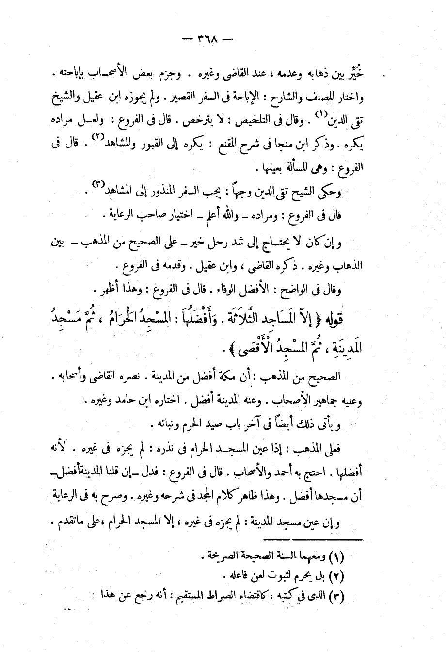 خُيِّرَ بَيْنَ ذَهَابِهِ وَعَدَمِهِ، عِنْدَ الْقَاضِي وَغَيْرِهِ، وَجَزَمَ بَعْضُ الْأَصْحَابِ بِإِبَاحَتِهِ، وَاخْتَارَ الْمُصَنِّفُ وَالشَّارِحُ: الْإِبَاحَةَ فِي السَّفَرِ الْقَصِيرِ، وَلَمْ يُجَوِّزْهُ ابْنُ عَقِيلٍ وَالشَّيْخُ تَقِيُّ الدِّينِ، وَقَالَ فِي التَّلْخِيصِ: لَا يَتَرَخَّصُ. قَالَ فِي الْفُرُوعِ: وَلَعَلَّ مُرَادَهُ يُكْرَهُ، وَذَكَرَ ابْنُ مُنَجَّى فِي شَرْحِ الْمُقْنِعِ: يُكْرَهُ إلَى الْقُبُورِ وَالْمَشَاهِدِ. قَالَ فِي الْفُرُوعِ: وَهِيَ الْمَسْأَلَةُ بِعَيْنِهَا، وَحَكَى الشَّيْخُ تَقِيُّ الدِّينِ وَجْهًا: يَجِبُ السَّفَرُ الْمَنْذُورُ إلَى الْمَشَاهِدِ. قَالَ فِي الْفُرُوعِ: مُرَادُهُ وَاَللَّهُ أَعْلَمُ اخْتِيَارُ صَاحِبِ الرِّعَايَةِ. وَإِنْ كَانَ لَا يَحْتَاجُ إلَى شَدِّ رَحْلٍ خُيِّرَ عَلَى الصَّحِيحِ مِنْ الْمَذْهَبِ بَيْنَ الذَّهَابِ وَغَيْرِهِ. ذَكَرَهُ الْقَاضِي، وَابْنُ عَقِيلٍ، وَقَدَّمَهُ فِي الْفُرُوعِ، وَقَالَ فِي الْوَاضِحِ: الْأَفْضَلُ الْوَفَاءُ. قَالَ فِي الْفُرُوعِ: وَهَذَا أَظْهَرُ. قَوْلُهُ (إلَّا الْمَسَاجِدَ الثَّلَاثَةَ، وَأَفْضَلُهَا: الْمَسْجِدُ الْحَرَامُ، ثُمَّ مَسْجِدُ الْمَدِينَةِ، ثُمَّ الْمَسْجِدُ الْأَقْصَى) ، الصَّحِيحُ مِنْ الْمَذْهَبِ: أَنَّ مَكَّةَ أَفْضَلُ مِنْ الْمَدِينَةِ، نَصَرَهُ الْقَاضِي وَأَصْحَابُهُ، وَعَلَيْهِ جَمَاهِيرُ الْأَصْحَابِ، وَعَنْهُ الْمَدِينَةُ أَفْضَلُ، اخْتَارَهُ ابْنُ حَامِدٍ وَغَيْرُهُ. وَيَأْتِي ذَلِكَ أَيْضًا فِي آخِرِ بَابِ صَيْدِ الْحَرَمِ وَنَبَاتِهِ، فَعَلَى الْمَذْهَبِ: إذَا عَيَّنَ الْمَسْجِدَ الْحَرَامَ فِي نَذْرِهِ: لَمْ يُجْزِهِ فِي غَيْرِهِ؛ لِأَنَّهُ أَفْضَلُهَا. احْتَجَّ بِهِ أَحْمَدُ وَالْأَصْحَابُ. قَالَ فِي الْفُرُوعِ: فَدَلَّ إنْ قُلْنَا الْمَدِينَةُ أَفْضَلُ أَنَّ مَسْجِدَهَا أَفْضَلُ، وَهَذَا ظَاهِرُ كَلَامِ الْمَجْدِ فِي شَرْحِهِ وَغَيْرِهِ، وَصَرَّحَ بِهِ فِي الرِّعَايَةِ وَإِنْ عَيَّنَ مَسْجِدَ الْمَدِينَةِ: لَمْ يُجْزِهِ فِي غَيْرِهِ، إلَّا الْمَسْجِدُ الْحَرَامُ، عَلَى مَا تَقَدَّمَ