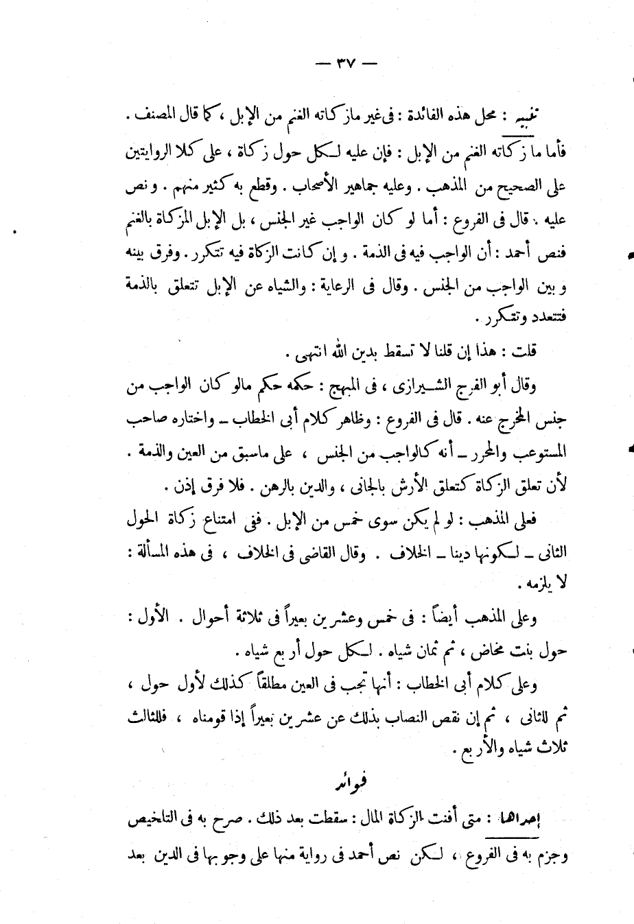 تَنْبِيهٌ: مَحَلُّ هَذِهِ الْفَائِدَةِ: فِي غَيْرِ مَا زَكَاتُهُ الْغَنَمُ مِنْ الْإِبِلِ، كَمَا قَالَ الْمُصَنِّفُ. فَأَمَّا مَا زَكَاتُهُ الْغَنَمُ مِنْ الْإِبِلِ: فَإِنَّ عَلَيْهِ لِكُلِّ حَوْلٍ زَكَاةً، عَلَى كِلَا الرِّوَايَتَيْنِ عَلَى الصَّحِيحِ مِنْ الْمَذْهَبِ، وَعَلَيْهِ جَمَاهِيرُ الْأَصْحَابِ. وَقَطَعَ بِهِ كَثِيرٌ مِنْهُمْ، وَنَصَّ عَلَيْهِ، قَالَ فِي الْفُرُوعِ: أَمَّا لَوْ كَانَ الْوَاجِبُ غَيْرَ الْجِنْسِ، بَلْ الْإِبِلُ الْمُزَكَّاةُ بِالْغَنَمِ فَنَصَّ أَحْمَدُ: أَنَّ الْوَاجِبَ فِيهِ فِي الذِّمَّةِ، وَإِنْ كَانَتْ الزَّكَاةُ فِيهِ تَتَكَرَّرُ، وَفَرَّقَ بَيْنَهُ وَبَيْنَ الْوَاجِبِ مِنْ الْجِنْسِ، وَقَالَ فِي الرِّعَايَةِ: وَالشِّيَاهُ عَنْ الْإِبِلِ تَتَعَلَّقُ بِالذِّمَّةِ فَتَتَعَدَّدُ وَتَتَكَرَّرُ. قُلْت: هَذَا إنْ قُلْنَا لَا تَسْقُطُ بِدَيْنِ اللَّهِ. انْتَهَى.