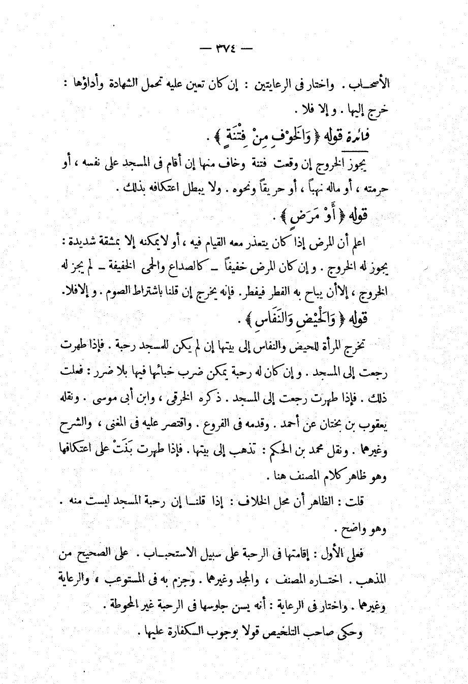 قَوْلُهُ (وَالْحَيْضِ وَالنِّفَاسِ) . تَخْرُجُ الْمَرْأَةُ لِلْحَيْضِ وَالنِّفَاسِ إلَى بَيْتِهَا إنْ لَمْ يَكُنْ لِلْمَسْجِدِ رَحْبَةٌ، فَإِذَا طَهُرَتْ رَجَعَتْ إلَى الْمَسْجِدِ، وَإِنْ كَانَ لَهُ رَحْبَةٌ يُمْكِنُ ضَرْبُ خِبَائِهَا فِيهَا بِلَا ضَرَرٍ: فَعَلَتْ ذَلِكَ، فَإِذَا طَهُرَتْ رَجَعَتْ إلَى الْمَسْجِدِ، ذَكَرَهُ الْخِرَقِيُّ، وَابْنُ أَبِي مُوسَى، وَنَقَلَهُ يَعْقُوبُ بْنُ بُخْتَانَ عَنْ أَحْمَدَ، وَقَدَّمَهُ فِي الْفُرُوعِ، وَاقْتَصَرَ عَلَيْهِ فِي الْمُغْنِي، وَالشَّرْحِ وَغَيْرِهِمَا، وَنَقَلَ مُحَمَّدُ بْنُ الْحَكَمِ: تَذْهَبُ إلَى بَيْتِهَا، فَإِذَا طَهُرَتْ بَنَتْ عَلَى اعْتِكَافِهَا وَهُوَ ظَاهِرُ كَلَامِ الْمُصَنِّفِ هُنَا. قُلْت: الظَّاهِرُ أَنَّ مَحَلَّ الْخِلَافِ: إذَا قُلْنَا إنَّ رَحْبَةَ الْمَسْجِدِ لَيْسَتْ مِنْهُ، وَهُوَ وَاضِحٌ. فَعَلَى الْأَوَّلِ: إقَامَتُهَا فِي الرَّحْبَةِ عَلَى سَبِيلِ الِاسْتِحْبَابِ عَلَى الصَّحِيحِ مِنْ الْمَذْهَبِ، اخْتَارَهُ الْمُصَنِّفُ، وَالْمَجْدُ وَغَيْرُهُمَا، وَجَزَمَ بِهِ فِي الْمُسْتَوْعِبِ، وَالرِّعَايَةِ وَغَيْرِهِمَا، وَاخْتَارَ فِي الرِّعَايَةِ: أَنَّهُ يُسَنُّ جُلُوسُهَا فِي الرَّحْبَةِ غَيْرِ الْمَحُوطَةِ، وَحَكَى صَاحِبُ التَّلْخِيصِ قَوْلًا بِوُجُوبِ الْكَفَّارَةِ عَلَيْهَا