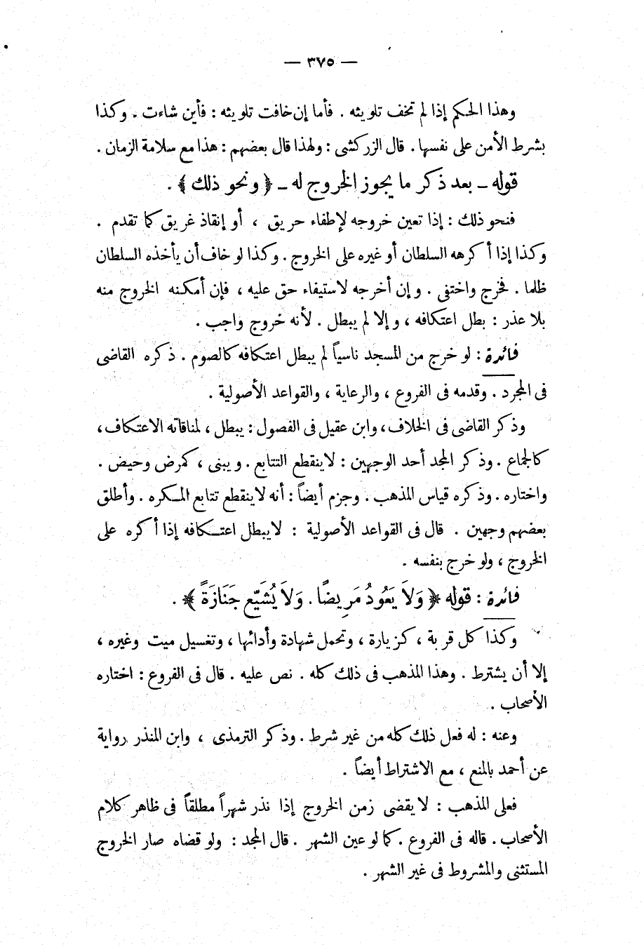 فَائِدَةٌ: قَوْلُهُ (وَلَا يَعُودُ مَرِيضًا، وَلَا يُشَيِّعُ جِنَازَةً) . كَذَا كُلُّ قُرْبَةٍ، كَزِيَارَةٍ، وَتَحَمُّلِ شَهَادَةٍ وَأَدَائِهَا، وَتَغْسِيلِ مَيِّتٍ وَغَيْرِهِ، إلَّا أَنْ يَشْتَرِطَ، وَهَذَا الْمَذْهَبُ فِي ذَلِكَ كُلِّهِ، نَصَّ عَلَيْهِ. قَالَ فِي الْفُرُوعِ: اخْتَارَهُ الْأَصْحَابُ، وَعَنْهُ: لَهُ فِعْلُ ذَلِكَ كُلِّهِ مِنْ غَيْرِ شَرْطٍ، وَذَكَرَ التِّرْمِذِيُّ، وَابْنُ الْمُنْذِرِ رِوَايَةً عَنْ أَحْمَدَ بِالْمَنْعِ، مَعَ الِاشْتِرَاطِ أَيْضًا، فَعَلَى الْمَذْهَبِ: لَا يَقْضِي زَمَنَ الْخُرُوجِ إذَا نَذَرَ شَهْرًا مُطْلَقًا فِي ظَاهِرِ كَلَامِ الْأَصْحَابِ. قَالَهُ فِي الْفُرُوعِ. كَمَا لَوْ عَيَّنَ الشَّهْرَ. قَالَ الْمَجْدُ: وَلَوْ قَضَاهُ صَارَ الْخُرُوجُ الْمُسْتَثْنَى وَالْمَشْرُوطُ فِي غَيْرِ الشَّهْرِ
