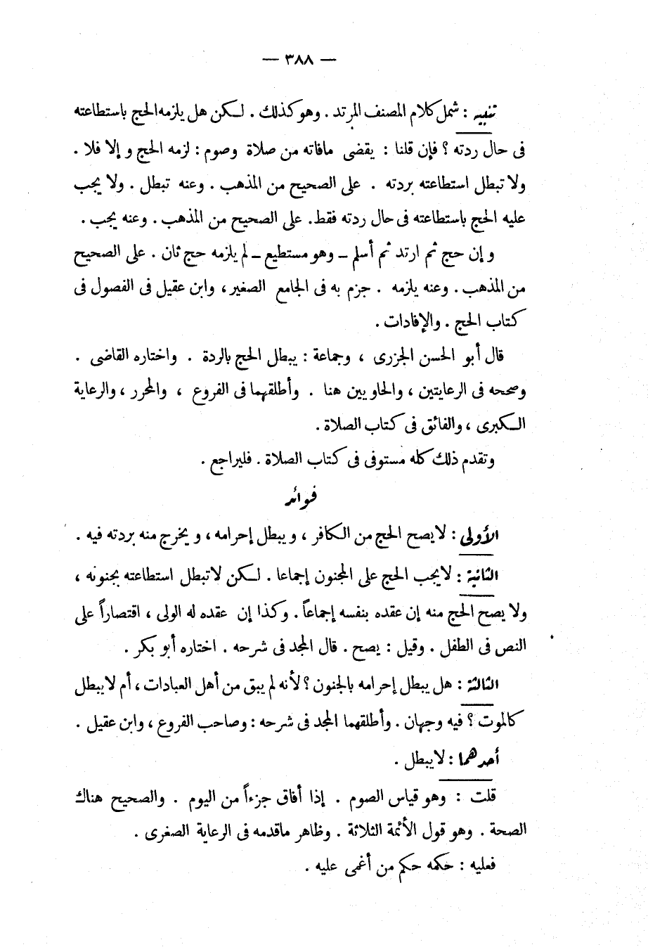 فَوَائِدُ. الْأُولَى: لَا يَصِحُّ الْحَجُّ مِنْ الْكَافِرِ، وَيَبْطُلُ إحْرَامُهُ، وَيَخْرُجُ مِنْهُ بِرِدَّتِهِ فِيهِ. الثَّانِيَةُ: لَا يَجِبُ الْحَجُّ عَلَى الْمَجْنُونِ إجْمَاعًا. لَكِنْ لَا تَبْطُلُ اسْتِطَاعَتُهُ بِجُنُونِهِ، وَلَا يَصِحُّ الْحَجُّ مِنْهُ إنْ عَقَدَهُ بِنَفْسِهِ إجْمَاعًا، وَكَذَا إنْ عَقَدَهُ لَهُ الْوَلِيُّ، اقْتِصَارًا عَلَى النَّصِّ فِي الطِّفْلِ، وَقِيلَ: يَصِحُّ. قَالَ الْمَجْدُ فِي شَرْحِهِ، اخْتَارَهُ أَبُو بَكْرٍ. الثَّالِثَةُ: هَلْ يَبْطُلُ إحْرَامُهُ بِالْجُنُونِ؟ لِأَنَّهُ لَمْ يَبْقَ مِنْ أَهْلِ الْعِبَادَاتِ، أَمْ لَا يَبْطُلُ كَالْمَوْتِ؟ فِيهِ وَجْهَانِ. وَأَطْلَقَهُمَا الْمَجْدُ فِي شَرْحِهِ: وَصَاحِبُ الْفُرُوعِ، وَابْنُ عَقِيلٍ.