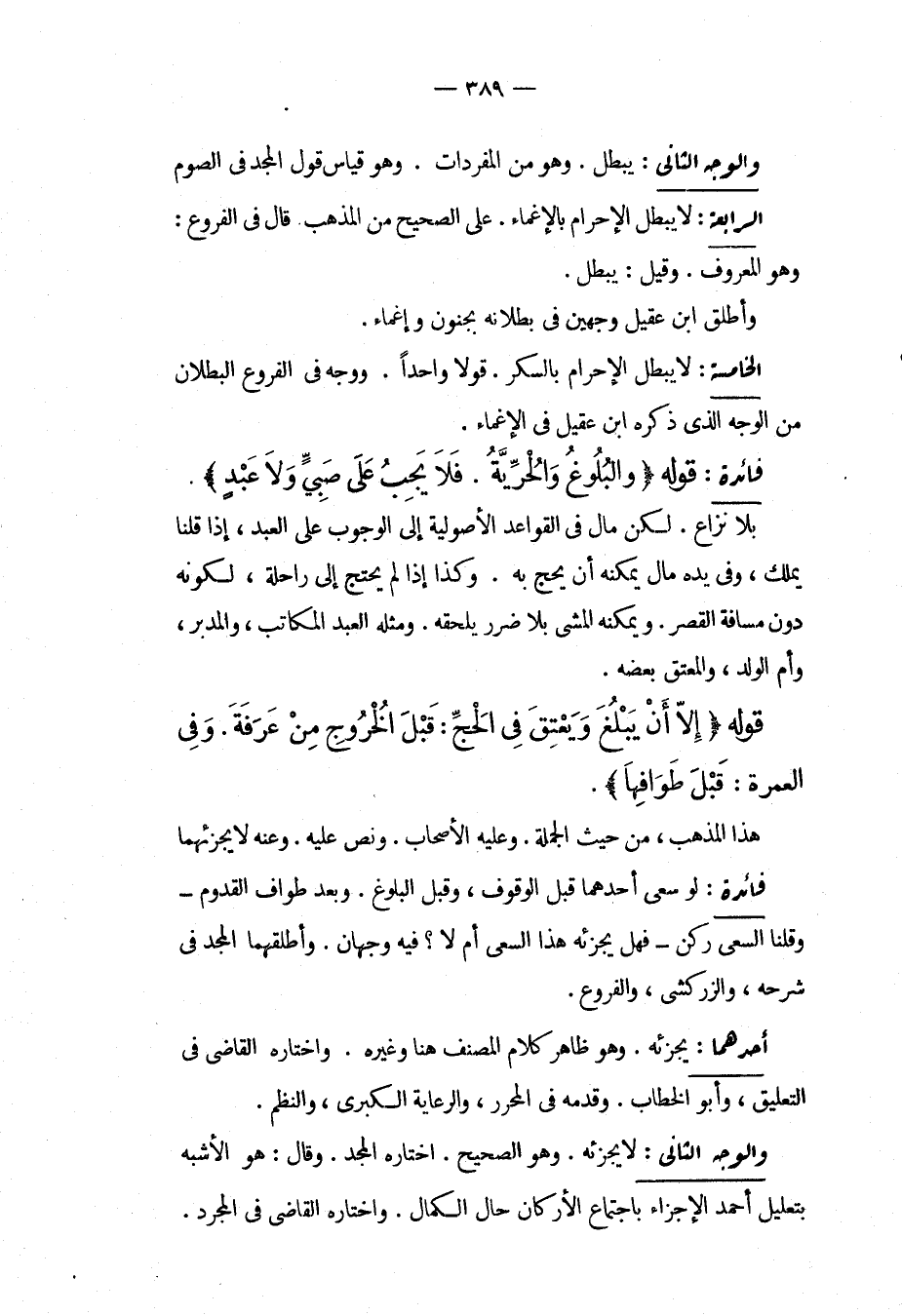 وَالْوَجْهُ الثَّانِي: يَبْطُلُ، وَهُوَ مِنْ الْمُفْرَدَاتِ، وَهُوَ قِيَاسُ قَوْلِ الْمَجْدِ فِي الصَّوْمِ. الرَّابِعَةُ: لَا يَبْطُلُ الْإِحْرَامُ بِالْإِغْمَاءِ عَلَى الصَّحِيحِ مِنْ الْمَذْهَبِ قَالَ فِي الْفُرُوعِ: وَهُوَ الْمَعْرُوفُ، وَقِيلَ: يَبْطُلُ، وَأَطْلَقَ ابْنُ عَقِيلٍ وَجْهَيْنِ فِي بُطْلَانِهِ بِجُنُونٍ وَإِغْمَاءٍ. الْخَامِسَةُ: لَا يَبْطُلُ الْإِحْرَامُ بِالسُّكْرِ. قَوْلًا وَاحِدًا، وَوَجَّهَ فِي الْفُرُوعِ الْبُطْلَانَ مِنْ الْوَجْهِ الَّذِي ذَكَرَهُ ابْنُ عَقِيلٍ فِي الْإِغْمَاءِ.