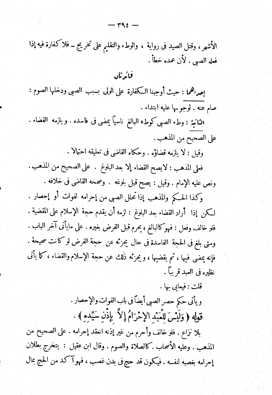 فَائِدَتَانِ. إحْدَاهُمَا: حَيْثُ أَوْجَبْنَا الْكَفَّارَةَ عَلَى الْوَلِيِّ بِسَبَبِ الصَّبِيِّ وَدَخَلَهَا الصَّوْمُ: صَامَ عَنْهُ؛ لِوُجُوبِهَا عَلَيْهِ ابْتِدَاءً. الثَّانِيَةُ: وَطْءُ الصَّبِيِّ كَوَطْءِ الْبَالِغِ نَاسِيًا يَمْضِي فِي فَاسِدِهِ، وَيَلْزَمُهُ الْقَضَاءُ عَلَى الصَّحِيحِ مِنْ الْمَذْهَبِ، وَقِيلَ: لَا يَلْزَمُهُ قَضَاؤُهُ، وَحَكَاهُ الْقَاضِي فِي تَعْلِيقِهِ احْتِمَالًا، فَعَلَى الْمَذْهَبِ: لَا يَصِحُّ الْقَضَاءُ إلَّا بَعْدَ الْبُلُوغِ عَلَى الصَّحِيحِ مِنْ الْمَذْهَبِ، وَنَصَّ عَلَيْهِ الْإِمَامُ، وَقِيلَ: يَصِحُّ قَبْلَ بُلُوغِهِ، وَصَحَّحَهُ الْقَاضِي فِي خِلَافِهِ، وَكَذَا الْحُكْمُ وَالْمَذْهَبُ إذَا تَحَلَّلَ الصَّبِيُّ مِنْ إحْرَامِهِ لِفَوَاتٍ أَوْ إحْصَارٍ. لَكِنْ إذَا أَرَادَ الْقَضَاءَ بَعْدَ الْبُلُوغِ: لَزِمَهُ أَنْ يُقَدِّمَ حَجَّةَ الْإِسْلَامِ عَلَى الْمَقْضِيَّةِ، فَلَوْ خَالَفَ وَفَعَلَ: فَهُوَ كَالْبَالِغِ، يُحْرِمُ قَبْلَ الْفَرْضِ بِغَيْرِهِ عَلَى مَا يَأْتِي آخِرَ الْبَابِ، وَمَتَى بَلَغَ فِي الْحَجَّةِ الْفَاسِدَةِ فِي حَالٍ يُجْزِئُهُ عَنْ حَجَّةِ الْفَرْضِ لَوْ كَانَتْ صَحِيحَةً، فَإِنَّهُ يَمْضِي فِيهَا، ثُمَّ يَقْضِيهَا، وَيُجْزِئُهُ ذَلِكَ عَنْ حَجَّةِ الْإِسْلَامِ وَالْقَضَاءِ، كَمَا يَأْتِي نَظِيرُهُ فِي الْعَبْدِ قَرِيبًا. قُلْت: فَيُعَايَى بِهَا. وَيَأْتِي حُكْمُ حَصْرِ الصَّبِيِّ أَيْضًا فِي بَابِ الْفَوَاتِ وَالْإِحْصَارِ.