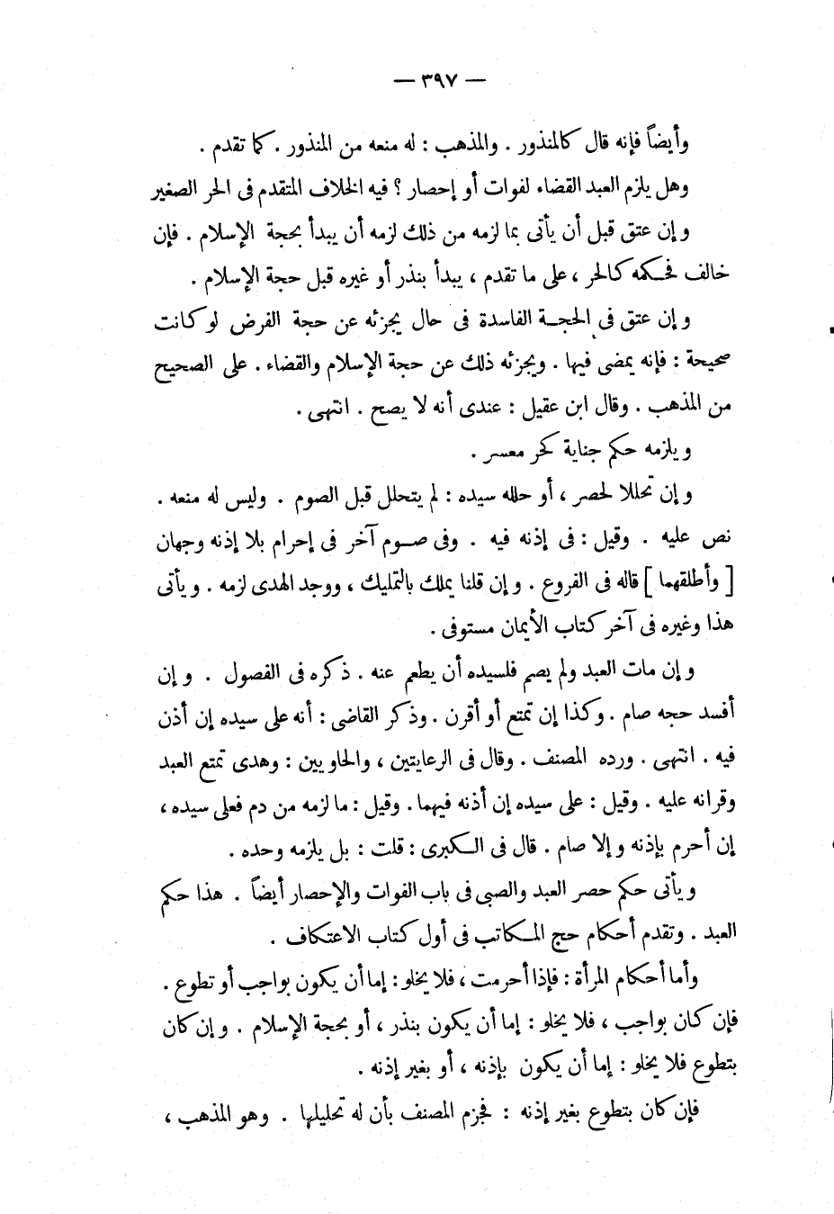 وَأَيْضًا فَإِنَّهُ قَالَ كَالْمَنْذُورِ، وَالْمَذْهَبُ: لَهُ مَنْعُهُ مِنْ الْمَنْذُورِ. كَمَا تَقَدَّمَ، وَهَلْ يَلْزَمُ الْعَبْدَ الْقَضَاءُ لِفَوَاتٍ أَوْ إحْصَارٍ؟ فِيهِ الْخِلَافُ الْمُتَقَدِّمُ فِي الْحُرِّ الصَّغِيرِ وَإِنْ عَتَقَ قَبْلَ أَنْ يَأْتِيَ بِمَا لَزِمَهُ مِنْ ذَلِكَ لَزِمَهُ أَنْ يَبْدَأَ بِحَجَّةِ الْإِسْلَامِ، فَإِنْ خَالَفَ فَحُكْمُهُ كَالْحُرِّ، عَلَى مَا تَقَدَّمَ، يَبْدَأُ بِنَذْرٍ أَوْ غَيْرِهِ قَبْلَ حَجَّةِ الْإِسْلَامِ. وَإِنْ عَتَقَ فِي الْحَجَّةِ الْفَاسِدَةِ فِي حَالٍ يُجْزِئُهُ عَنْ حَجَّةِ الْفَرْضِ لَوْ كَانَتْ صَحِيحَةً: فَإِنَّهُ يَمْضِي فِيهَا، وَيُجْزِئُهُ ذَلِكَ عَنْ حَجَّةِ الْإِسْلَامِ وَالْقَضَاءِ عَلَى الصَّحِيحِ مِنْ الْمَذْهَبِ، وَقَالَ ابْنُ عَقِيلٍ: عِنْدِي أَنَّهُ لَا يَصِحُّ. انْتَهَى. وَيَلْزَمُهُ حُكْمُ جِنَايَةٍ كَحُرٍّ مُعْسِرٍ، وَإِنْ تَحَلَّلَا لِحَصْرٍ، أَوْ حَلَّلَهُ سَيِّدُهُ: لَمْ يَتَحَلَّلْ قَبْلَ الصَّوْمِ، وَلَيْسَ لَهُ مَنْعُهُ، نَصَّ عَلَيْهِ، وَقِيلَ: فِي إذْنِهِ فِيهِ، وَفِي صَوْمٍ آخَرَ فِي إحْرَامٍ بِلَا إذْنِهِ وَجْهَانِ [وَأَطْلَقَهُمَا] قَالَهُ فِي الْفُرُوعِ، وَإِنْ قُلْنَا يَمْلِكُ بِالتَّمْلِيكِ، وَوَجَدَ الْهَدْيَ لَزِمَهُ. وَيَأْتِي هَذَا وَغَيْرُهُ فِي آخِرِ كِتَابِ الْأَيْمَانِ مُسْتَوْفًى، وَإِنْ مَاتَ الْعَبْدُ وَلَمْ يَصُمْ فَلِسَيِّدِهِ أَنْ يُطْعِمَ عَنْهُ. ذَكَرَهُ فِي الْفُصُولِ، وَإِنْ أَفْسَدَ حَجَّهُ صَامَ، وَكَذَا إنْ تَمَتَّعَ أَوْ أَقْرَنَ. وَذَكَرَ الْقَاضِي: أَنَّهُ عَلَى سَيِّدِهِ إنْ أَذِنَ فِيهِ. انْتَهَى. وَرَدَّهُ الْمُصَنِّفُ، وَقَالَ فِي الرِّعَايَتَيْنِ، وَالْحَاوِيَيْنِ: وَهَدْيُ تَمَتُّعِ الْعَبْدِ وَقِرَانِهِ عَلَيْهِ، وَقِيلَ: عَلَى سَيِّدِهِ إنْ أَذِنَهُ فِيهِمَا، وَقِيلَ: مَا لَزِمَهُ مِنْ دَمٍ فَعَلَى سَيِّدِهِ، إنْ أَحْرَمَ بِإِذْنِهِ وَإِلَّا صَامَ. قَالَ فِي الْكُبْرَى: قُلْت: بَلْ يَلْزَمُهُ وَحْدَهُ. وَيَأْتِي حُكْمُ حَصْرِ الْعَبْدِ وَالصَّبِيِّ فِي بَابِ الْفَوَاتِ وَالْإِحْصَارِ أَيْضًا. هَذَا حُكْمُ الْعَبْدِ، وَتَقَدَّمَ أَحْكَامُ حَجِّ الْمُكَاتَبِ فِي أَوَّلِ كِتَابِ الِاعْتِكَافِ.