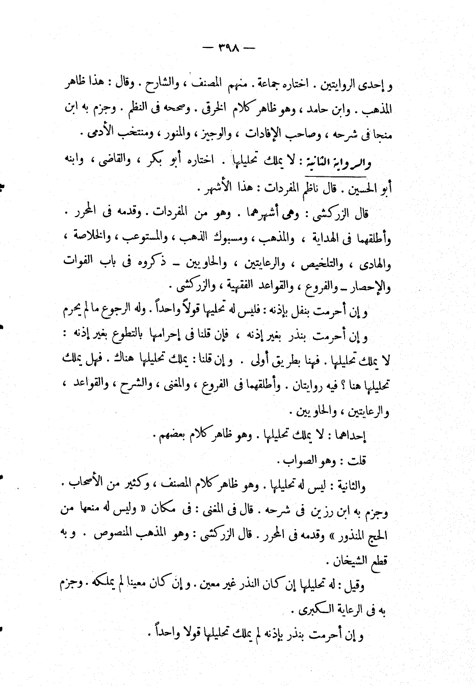 وَإِحْدَى الرِّوَايَتَيْنِ، اخْتَارَهُ جَمَاعَةٌ. مِنْهُمْ الْمُصَنِّفُ، وَالشَّارِحُ، وَقَالَ: هَذَا ظَاهِرُ الْمَذْهَبِ. وَابْنُ حَامِدٍ، وَهُوَ ظَاهِرُ كَلَامِ الْخِرَقِيِّ، وَصَحَّحَهُ فِي النَّظْمِ، وَجَزَمَ بِهِ ابْنُ مُنَجَّى فِي شَرْحِهِ، وَصَاحِبُ الْإِفَادَاتِ، وَالْوَجِيزِ، وَالْمُنَوِّرِ، وَمُنْتَخَبِ الْأَدَمِيِّ. وَالرِّوَايَةُ الثَّانِيَةُ: لَا يَمْلِكُ تَحْلِيلَهَا، اخْتَارَهُ أَبُو بَكْرٍ، وَالْقَاضِي، وَابْنُهُ أَبُو الْحُسَيْنِ. قَالَ نَاظِمُ الْمُفْرَدَاتِ: هَذَا الْأَشْهَرُ. قَالَ الزَّرْكَشِيُّ: وَهِيَ أَشْهَرُهُمَا، وَهُوَ مِنْ الْمُفْرَدَاتِ، وَقَدَّمَهُ فِي الْمُحَرَّرِ، وَأَطْلَقَهُمَا فِي الْهِدَايَةِ، وَالْمُذْهَبِ وَمَسْبُوكِ الذَّهَبِ، وَالْمُسْتَوْعِبِ، وَالْخُلَاصَةِ، وَالْهَادِي، وَالتَّلْخِيصِ، وَالرِّعَايَتَيْنِ، وَالْحَاوِيَيْنِ ذَكَرُوهُ فِي بَابِ الْفَوَاتِ وَالْإِحْصَارِ وَالْفُرُوعِ، وَالْقَوَاعِدِ الْفِقْهِيَّةِ، وَالزَّرْكَشِيُّ، وَإِنْ أَحْرَمَتْ بِنَفْلٍ بِإِذْنِهِ: فَلَيْسَ لَهُ تَحْلِيلُهَا قَوْلًا وَاحِدًا، وَلَهُ الرُّجُوعُ مَا لَمْ يُحْرِمْ وَإِنْ أَحْرَمَتْ بِنَذْرٍ بِغَيْرِ إذْنِهِ، فَإِنْ قُلْنَا فِي إحْرَامِهَا بِالتَّطَوُّعِ بِغَيْرِ إذْنِهِ: لَا يَمْلِكُ تَحْلِيلَهَا، فَهُنَا بِطَرِيقِ أَوْلَى، وَإِنْ قُلْنَا: يَمْلِكُ تَحْلِيلَهَا هُنَاكَ، فَهَلْ يَمْلِكُ تَحْلِيلَهَا هُنَا؟ فِيهِ رِوَايَتَانِ، وَأَطْلَقَهُمَا فِي الْفُرُوعِ، وَالْمُغْنِي، وَالشَّرْحِ، وَالْقَوَاعِدِ، وَالرِّعَايَتَيْنِ، وَالْحَاوِيَيْنِ. إحْدَاهُمَا: لَا يَمْلِكُ تَحْلِيلَهَا، وَهُوَ ظَاهِرُ كَلَامِ بَعْضِهِمْ. قُلْت: وَهُوَ الصَّوَابُ، وَالثَّانِيَةُ: لَيْسَ لَهُ تَحْلِيلُهَا. وَهُوَ ظَاهِرُ كَلَامِ الْمُصَنِّفِ، وَكَثِيرٍ مِنْ الْأَصْحَابِ، وَجَزَمَ بِهِ ابْنُ رَزِينٍ فِي شَرْحِهِ. قَالَ الْمُغْنِي: فِي مَكَان " وَلَيْسَ لَهُ مَنْعُهَا مِنْ الْحَجِّ الْمَنْذُورِ " وَقَدَّمَهُ فِي الْمُحَرَّرِ. قَالَ الزَّرْكَشِيُّ: وَهُوَ الْمَذْهَبُ الْمَنْصُوصُ، وَبِهِ قَطَعَ الشَّيْخَانِ، وَقِيلَ: لَهُ تَحْلِيلُهَا إنْ كَانَ النَّذْرُ غَيْرَ مُعَيَّنٍ، وَإِنْ كَانَ مُعَيَّنًا لَمْ يَمْلِكْهُ. وَجَزَمَ بِهِ فِي الرِّعَايَةِ الْكُبْرَى، وَإِنْ أَحْرَمَتْ بِنَذْرٍ بِإِذْنِهِ لَمْ يَمْلِكْ تَحْلِيلَهَا قَوْلًا وَاحِدًا