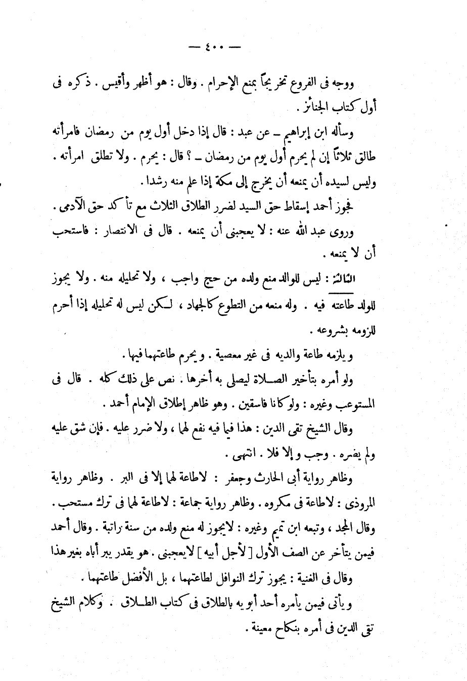 وَوَجَّهَ فِي الْفُرُوعِ تَخْرِيجًا بِمَنْعِ الْإِحْرَامِ. وَقَالَ: هُوَ أَظْهَرُ وَأَقْيَسُ. ذَكَرَهُ فِي أَوَّلِ كِتَابِ الْجَنَائِزِ، وَسَأَلَهُ ابْنُ إبْرَاهِيمَ عَنْ عَبْدٍ: قَالَ إذَا دَخَلَ أَوَّلُ يَوْمٍ مِنْ رَمَضَانَ فَامْرَأَتُهُ طَالِقٌ ثَلَاثًا إنْ لَمْ يُحْرِمْ أَوَّلَ يَوْمٍ مِنْ رَمَضَانَ؟ قَالَ: يُحْرِمُ، وَلَا تَطْلُقُ امْرَأَتُهُ. وَلَيْسَ لِسَيِّدِهِ أَنْ يَمْنَعَهُ أَنْ يَخْرُجَ إلَى مَكَّةَ إذَا عَلِمَ مِنْهُ رُشْدًا، فَجَوَّزَ أَحْمَدُ إسْقَاطَ حَقِّ السَّيِّدِ لِضَرَرِ الطَّلَاقِ الثَّلَاثِ مَعَ تَأَكُّدِ حَقِّ الْآدَمِيِّ، وَرَوَى عَبْدُ اللَّهِ عَنْهُ: لَا يُعْجِبُنِي أَنْ يَمْنَعَهُ. قَالَ فِي الِانْتِصَارِ: فَاسْتُحِبَّ أَنْ لَا يَمْنَعَهُ.