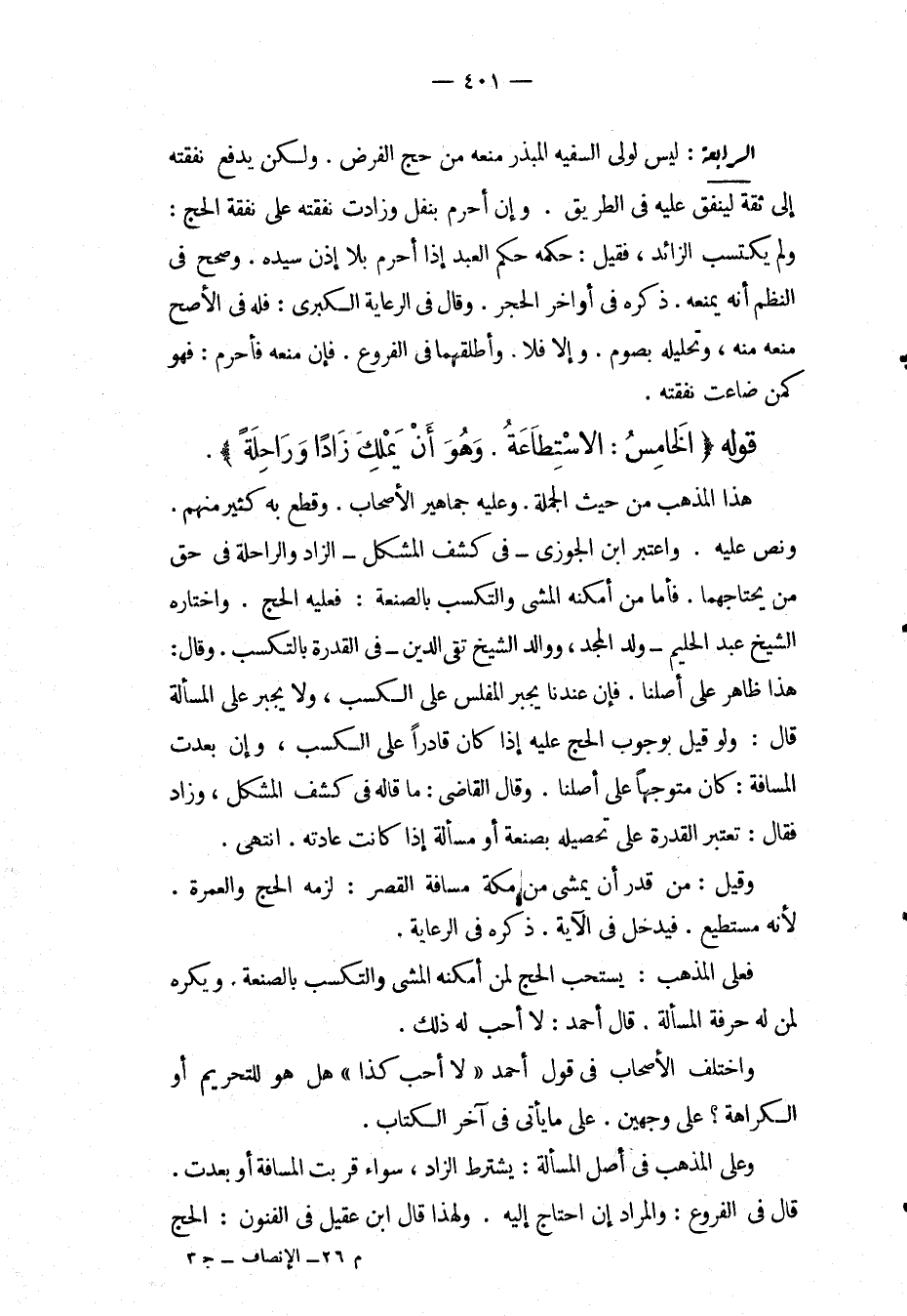 قَوْلُهُ (الْخَامِسُ: الِاسْتِطَاعَةُ، وَهُوَ أَنْ يَمْلِكَ زَادًا وَرَاحِلَةً) . هَذَا الْمَذْهَبُ مِنْ حَيْثُ الْجُمْلَةُ، وَعَلَيْهِ جَمَاهِيرُ الْأَصْحَابِ، وَقَطَعَ بِهِ كَثِيرٌ مِنْهُمْ، وَنَصَّ عَلَيْهِ، وَاعْتَبَرَ ابْنُ الْجَوْزِيِّ فِي كَشْفِ الْمُشْكِلِ الزَّادَ وَالرَّاحِلَةَ فِي حَقِّ مَنْ يَحْتَاجُهُمَا، فَأَمَّا مَنْ أَمْكَنَهُ الْمَشْيُ وَالتَّكَسُّبُ بِالصَّنْعَةِ: فَعَلَيْهِ الْحَجُّ، وَاخْتَارَهُ الشَّيْخُ عَبْدُ الْحَلِيمِ وَلَدُ الْمَجْدِ وَوَالِدُ الشَّيْخِ تَقِيِّ الدِّينِ فِي الْقُدْرَةِ بِالتَّكَسُّبِ. وَقَالَ: هَذَا ظَاهِرٌ عَلَى أَصْلِنَا، فَإِنَّ عِنْدَنَا يُجْبَرُ الْمُفْلِسُ عَلَى الْكَسْبِ، وَلَا يُجْبَرُ عَلَى الْمَسْأَلَةِ قَالَ: وَلَوْ قِيلَ بِوُجُوبِ الْحَجِّ عَلَيْهِ إذَا كَانَ قَادِرًا عَلَى الْكَسْبِ، وَإِنْ بَعُدَتْ الْمَسَافَةُ: كَانَ مُتَوَجِّهًا عَلَى أَصْلِنَا، وَقَالَ الْقَاضِي: مَا قَالَهُ فِي كَشْفِ الْمُشْكِلِ، وَزَادَ فَقَالَ: تُعْتَبَرُ الْقُدْرَةُ عَلَى تَحْصِيلِهِ بِصَنْعَةٍ أَوْ مَسْأَلَةٍ إذَا كَانَتْ عَادَتَهُ. انْتَهَى. وَقِيلَ: مَنْ قَدَرَ أَنْ يَمْشِيَ مِنْ مَكَّةَ مَسَافَةَ الْقَصْرِ: لَزِمَهُ الْحَجُّ وَالْعُمْرَةُ؛ لِأَنَّهُ مُسْتَطِيعٌ، فَيَدْخُلُ فِي الْآيَةِ. ذَكَرَهُ فِي الرِّعَايَةِ، فَعَلَى الْمَذْهَبِ: يُسْتَحَبُّ الْحَجُّ لِمَنْ أَمْكَنَهُ الْمَشْيُ وَالتَّكَسُّبُ بِالصَّنْعَةِ، وَيُكْرَهُ لِمَنْ لَهُ حِرْفَةٌ الْمَسْأَلَةُ. قَالَ أَحْمَدُ: لَا أُحِبُّ لَهُ ذَلِكَ، وَاخْتَلَفَ الْأَصْحَابُ فِي قَوْلِ أَحْمَدَ " لَا أُحِبُّ كَذَا " هَلْ هُوَ لِلتَّحْرِيمِ أَوْ الْكَرَاهَةِ؟ عَلَى وَجْهَيْنِ. عَلَى مَا يَأْتِي فِي آخِرِ الْكِتَابِ. وَعَلَى الْمَذْهَبِ فِي أَصْلِ الْمَسْأَلَةِ: يُشْتَرَطُ الزَّادُ، سَوَاءٌ قَرُبَتْ الْمَسَافَةُ أَوْ بَعُدَتْ. قَالَ فِي الْفُرُوعِ: وَالْمُرَادُ إنْ احْتَاجَ إلَيْهِ. وَلِهَذَا قَالَ ابْنُ عَقِيلٍ فِي الْفُنُونِ: الْحَجُّ