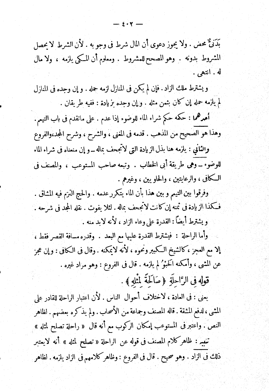 أَحَدُهُمَا: حُكْمُهُ حُكْمُ شِرَاءِ الْمَاءِ لِلْوُضُوءِ إذَا عُدِمَ. عَلَى مَا تَقَدَّمَ فِي بَابِ التَّيَمُّمِ، وَهَذَا هُوَ الصَّحِيحُ مِنْ الْمَذْهَبِ، قَدَّمَهُ فِي الْمُغْنِي، وَالشَّرْحِ، وَشَرْحِ الْمَجْدِ، وَالْفُرُوعِ، وَالثَّانِي: يَلْزَمُهُ هُنَا بَذْلُ الزِّيَادَةِ الَّتِي لَا تُجْحِفُ بِمَالِهِ وَإِنْ مَنَعْنَاهُ فِي شِرَاءِ الْمَاءِ لِلْوُضُوءِ وَهِيَ طَرِيقَةُ أَبِي الْخَطَّابِ، وَتَبِعَهُ صَاحِبُ الْمُسْتَوْعِبِ، وَالْمُصَنِّفُ فِي الْكَافِي، وَالرِّعَايَتَيْنِ، وَالْحَاوِيَيْنِ، وَغَيْرِهِمْ، وَفَرَّقُوا بَيْنَ التَّيَمُّمِ وَبَيْنَ هَذَا بِأَنَّ الْمَاءَ يَتَكَرَّرُ عَدَمُهُ، وَالْحَجُّ الْتَزَمَ فِيهِ الْمَشَاقَّ. فَكَذَا الزِّيَادَةُ فِي ثَمَنِهِ إنْ كَانَتْ لَا تُجْحِفُ بِمَالِهِ. لِئَلَّا يَفُوتَ. نَقَلَهُ الْمَجْدُ فِي شَرْحِهِ، وَيُشْتَرَطُ أَيْضًا: الْقُدْرَةُ عَلَى وِعَاءِ الزَّادِ؛ لِأَنَّهُ لَا بُدَّ مِنْهُ. وَأَمَّا الرَّاحِلَةُ: فَيُشْتَرَطُ الْقُدْرَةُ عَلَيْهَا مَعَ الْبُعْدِ، وَقَدْرُهُ مَسَافَةُ الْقَصْرِ فَقَطْ، إلَّا مَعَ الْعَجْزِ، كَالشَّيْخِ الْكَبِيرِ وَنَحْوِهِ؛ لِأَنَّهُ لَا يُمْكِنُهُ، وَقَالَ فِي الْكَافِي: وَإِنْ عَجَزَ عَنْ الْمَشْيِ، وَأَمْكَنَهُ الْحَبْوُ لَمْ يَلْزَمْهُ. قَالَ فِي الْفُرُوعِ: وَهُوَ مُرَادُ غَيْرِهِ. قَوْلُهُ فِي الرَّاحِلَةِ (صَالِحَةٌ لِمِثْلِهِ) . يَعْنِي: فِي الْعَادَةِ؛ لِاخْتِلَافِ أَحْوَالِ النَّاسِ؛ لِأَنَّ اعْتِبَارَ الرَّاحِلَةِ لِلْقَادِرِ عَلَى الْمَشْيِ؛ لِدَفْعِ الْمَشَقَّةِ. قَالَهُ الْمُصَنِّفُ وَجَمَاعَةٌ مِنْ الْأَصْحَابِ، وَلَمْ يَذْكُرْهُ بَعْضُهُمْ؛ لِظَاهِرِ النَّصِّ، وَاعْتَبَرَ فِي الْمُسْتَوْعِبِ إمْكَانَ الرُّكُوبِ مَعَ أَنَّهُ قَالَ " رَاحِلَةٌ تَصْلُحُ لِمِثْلِهِ " تَنْبِيهٌ: ظَاهِرُ كَلَامِ الْمُصَنِّفِ فِي قَوْلِهِ عَنْ الرَّاحِلَةِ " تَصْلُحُ لِمِثْلِهِ " أَنَّهُ لَا يُعْتَبَرُ ذَلِكَ فِي الزَّادِ. وَهُوَ صَحِيحٌ. قَالَ فِي الْفُرُوعِ: وَظَاهِرُ كَلَامِهِمْ فِي الزَّادِ يَلْزَمُهُ؛ لِظَاهِرِ