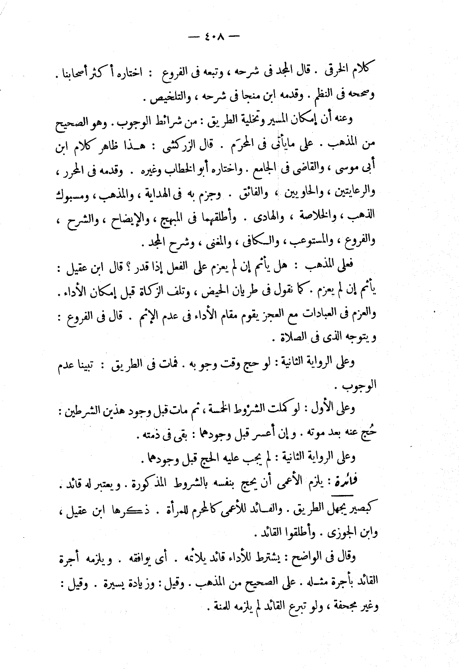 كَلَامِ الْخِرَقِيِّ. قَالَ الْمَجْدُ فِي شَرْحِهِ، وَتَبِعَهُ فِي الْفُرُوعِ: اخْتَارَهُ أَكْثَرُ أَصْحَابِنَا. وَصَحَّحَهُ فِي النَّظْمِ، وَقَدَّمَهُ ابْنُ مُنَجَّى فِي شَرْحِهِ، وَالتَّلْخِيصِ، وَعَنْهُ أَنَّ إمْكَانَ الْمَسِيرِ وَتَخْلِيَةَ الطَّرِيقِ: مِنْ شَرَائِطِ الْوُجُوبِ، وَهُوَ الصَّحِيحُ مِنْ الْمَذْهَبِ عَلَى مَا يَأْتِي فِي الْمُحْرِمِ. قَالَ الزَّرْكَشِيُّ: هَذَا ظَاهِرُ كَلَامِ ابْنِ أَبِي مُوسَى، وَالْقَاضِي فِي الْجَامِعِ، وَاخْتَارَهُ أَبُو الْخَطَّابِ وَغَيْرُهُ، وَقَدَّمَهُ فِي الْمُحَرَّرِ، وَالرِّعَايَتَيْنِ، وَالْحَاوِيَيْنِ، وَالْفَائِقِ، وَجَزَمَ بِهِ فِي الْهِدَايَةِ، وَالْمُذْهَبِ، وَمَسْبُوكِ الذَّهَبِ، وَالْخُلَاصَةِ، وَالْهَادِي. وَأَطْلَقَهُمَا فِي الْمُبْهِجِ، وَالْإِيضَاحِ، وَالشَّرْحِ، وَالْفُرُوعِ، وَالْمُسْتَوْعِبِ، وَالْكَافِي، وَالْمُغْنِي، وَشَرْحِ الْمَجْدِ، فَعَلَى الْمَذْهَبِ: هَلْ يَأْثَمُ إنْ لَمْ يَعْزِمْ عَلَى الْفِعْلِ إذَا قَدَرَ؟ قَالَ ابْنُ عَقِيلٍ: يَأْثَمُ إنْ لَمْ يَعْزِمْ. كَمَا نَقُولُ فِي طَرَيَان الْحَيْضِ، وَتَلَفِ الزَّكَاةِ قَبْلَ إمْكَانِ الْأَدَاءِ. وَالْعَزْمُ فِي الْعِبَادَاتِ مَعَ الْعَجْزِ يَقُومُ مَقَامَ الْأَدَاءِ فِي عَدَمِ الْإِثْمِ. قَالَ فِي الْفُرُوعِ: وَيَتَوَجَّهُ الَّذِي فِي الصَّلَاةِ، وَعَلَى الرِّوَايَةِ الثَّانِيَةِ: لَوْ حَجَّ وَقْتَ وُجُوبِهِ، فَمَاتَ فِي الطَّرِيقِ: تَبَيَّنَّا عَدَمَ الْوُجُوبِ، وَعَلَى الْأَوَّلِ: لَوْ كَمُلَتْ الشُّرُوطُ الْخَمْسَةُ، ثُمَّ مَاتَ قَبْلَ وُجُودِ هَذَيْنِ الشَّرْطَيْنِ: حَجَّ عَنْهُ بَعْدَ مَوْتِهِ. وَإِنْ أَعْسَرَ قَبْلَ وُجُودِهِمَا: بَقِيَ فِي ذِمَّتِهِ، وَعَلَى الرِّوَايَةِ الثَّانِيَةِ: لَمْ يَجِبْ عَلَيْهِ الْحَجُّ قَبْلَ وُجُودِهِمَا.