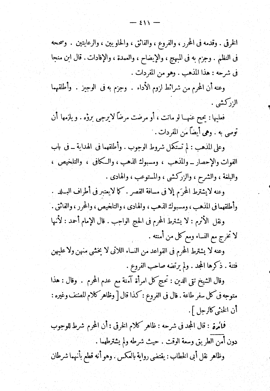 الْخِرَقِيِّ، وَقَدَّمَهُ فِي الْمُحَرَّرِ، وَالْفُرُوعِ، وَالْفَائِقِ، وَالْحَاوِيَيْنِ، وَالرِّعَايَتَيْنِ، وَصَحَّحَهُ فِي النَّظْمِ، وَجَزَمَ بِهِ فِي الْمُبْهِجِ، وَالْإِيضَاحِ، وَالْعُمْدَةِ، وَالْإِفَادَاتِ. قَالَ ابْنُ مُنَجَّى فِي شَرْحِهِ: هَذَا الْمَذْهَبُ، وَهُوَ مِنْ الْمُفْرَدَاتِ، وَعَنْهُ أَنَّ الْمَحْرَمَ مِنْ شَرَائِطِ لُزُومِ الْأَدَاءِ، وَجَزَمَ بِهِ فِي الْوَجِيزِ، وَأَطْلَقَهُمَا الزَّرْكَشِيُّ، فَعَلَيْهَا: يُحَجُّ عَنْهَا لَوْ مَاتَتْ، أَوْ مَرِضَتْ مَرَضًا لَا يُرْجَى بُرْؤُهُ، وَيَلْزَمُهَا أَنْ تُوصِيَ بِهِ. وَهِيَ أَيْضًا مِنْ الْمُفْرَدَاتِ.، وَعَلَى الْمَذْهَبُ: لَمْ تَسْتَكْمِلْ شُرُوطَ الْوُجُوبِ، وَأَطْلَقَهُمَا فِي الْهِدَايَةِ فِي بَابِ الْفَوَاتِ وَالْإِحْصَارِ وَالْمُذْهَبِ، وَمَسْبُوكِ الذَّهَبِ، وَالْكَافِي، وَالتَّلْخِيصِ، وَالْبُلْغَةِ، وَالشَّرْحِ، وَالزَّرْكَشِيِّ، وَالْمُسْتَوْعِبِ، وَالْهَادِي، وَعَنْهُ لَا يُشْتَرَطُ الْمَحْرَمُ إلَّا فِي مَسَافَةِ الْقَصْرِ. كَمَا لَا يُعْتَبَرُ فِي أَطْرَافِ الْبَلَدِ، وَأَطْلَقَهُمَا فِي الْمُذْهَبِ، وَمَسْبُوكِ الذَّهَبِ، وَالْهَادِي، وَالتَّلْخِيصِ، وَالْمُحَرَّرِ، وَالْفَائِقِ، وَنَقَلَ الْأَثْرَمُ: لَا يُشْتَرَطُ الْمَحْرَمُ فِي الْحَجِّ الْوَاجِبِ. قَالَ الْإِمَامُ أَحْمَدُ: لِأَنَّهَا لَا تَخْرُجُ مَعَ النِّسَاءِ وَمَعَ كُلِّ مَنْ أَمِنَتْهُ، وَعَنْهُ لَا يُشْتَرَطُ الْمَحْرَمُ فِي الْقَوَاعِدِ مِنْ النِّسَاءِ اللَّاتِي لَا يُخْشَى مِنْهُنَّ وَلَا عَلَيْهِنَّ فِتْنَةٌ. ذَكَرَهَا الْمَجْدُ، وَلَمْ يَرْتَضِهِ صَاحِبُ الْفُرُوعِ.