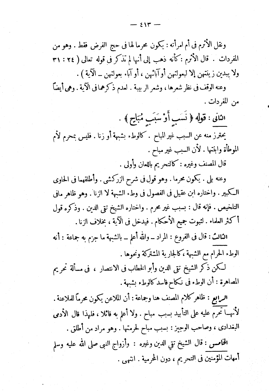 الثَّانِي: قَوْلُهُ (نَسَبٍ أَوْ سَبَبٍ مُبَاحٍ) يُحْتَرَزُ مِنْهُ عَنْ السَّبَبِ غَيْرِ الْمُبَاحِ. كَالْوَطْءِ بِشُبْهَةٍ أَوْ زِنًا، فَلَيْسَ بِمَحْرَمٍ لِأُمِّ الْمَوْطُوءَةِ وَابْنَتِهَا؛ لِأَنَّ السَّبَبَ غَيْرُ مُبَاحٍ، قَالَ الْمُصَنِّفُ وَغَيْرُهُ: كَالتَّحْرِيمِ بِاللِّعَانِ وَأَوْلَى، وَعَنْهُ بَلَى. يَكُونُ مَحْرَمًا، وَهُوَ قَوْلٌ فِي شَرْحِ الزَّرْكَشِيّ، وَأَطْلَقَهُمَا فِي الْحَاوِي الْكَبِيرِ، وَاخْتَارَهُ ابْنُ عَقِيلٍ فِي الْفُصُولِ فِي وَطْءِ الشُّبْهَةِ لَا الزِّنَا. وَهُوَ ظَاهِرُ مَا فِي التَّلْخِيصِ، فَإِنَّهُ قَالَ: بِسَبَبٍ غَيْرِ مُحَرَّمٍ، وَاخْتَارَهُ الشَّيْخُ تَقِيُّ الدِّينِ، وَذَكَرَهُ قَوْلُ أَكْثَرِ الْعُلَمَاءِ؛ لِثُبُوتِ جَمِيعِ الْأَحْكَامِ، فَيَدْخُلُ فِي الْآيَةِ، بِخِلَافِ الزِّنَا.