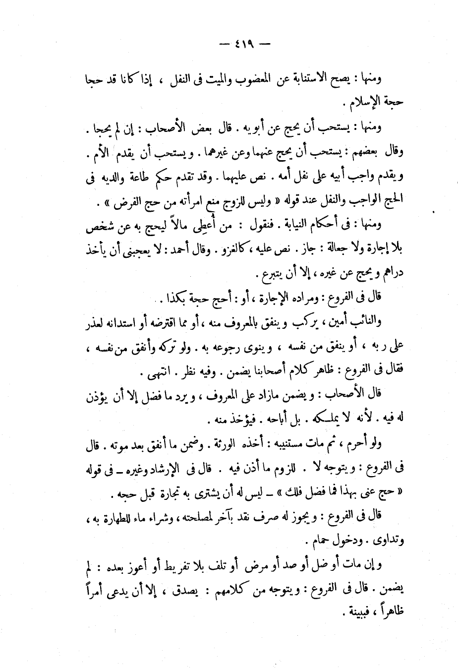 ، وَمِنْهَا: فِي أَحْكَامِ النِّيَابَةِ، فَنَقُولُ: مَنْ أَعْطَى مَالًا لِيَحُجَّ بِهِ عَنْ شَخْصٍ بِلَا إجَارَةٍ وَلَا جَعَالَةٍ: جَازَ، نَصَّ عَلَيْهِ كَالْغَزْوِ، وَقَالَ أَحْمَدُ: لَا يُعْجِبُنِي أَنْ يَأْخُذَ دَرَاهِمَ وَيَحُجَّ عَنْ غَيْرِهِ، إلَّا أَنْ يَتَبَرَّعَ، قَالَ فِي الْفُرُوعِ: وَمُرَادُهُ لِلْإِجَارَةِ، أَوْ: أَحُجُّ حَجَّةً بِكَذَا، وَالنَّائِبُ أَمِينٌ، يَرْكَبُ وَيُنْفِقُ بِالْمَعْرُوفِ مِنْهُ، أَوْ مِمَّا اقْتَرَضَهُ أَوْ اسْتَدَانَهُ لِعُذْرٍ عَلَى رَبِّهِ، أَوْ يُنْفِقُ مِنْ نَفْسِهِ، وَيَنْوِي رُجُوعَهُ بِهِ، وَتَرَكَهُ وَأَنْفَقَ مِنْ نَفْسِهِ، فَقَالَ فِي الْفُرُوعِ: ظَاهِرُ كَلَامِ أَصْحَابِنَا يَضْمَنُ وَفِيهِ نَظَرٌ. انْتَهَى. قَالَ الْأَصْحَابُ: وَيَضْمَنُ مَا زَادَ عَلَى الْمَعْرُوفِ، وَيَرُدُّ مَا فَضَلَ إلَّا أَنْ يُؤْذَنَ لَهُ فِيهِ؛ لِأَنَّهُ لَا يَمْلِكُهُ بَلْ أَبَاحَهُ، فَيُؤْخَذُ مِنْهُ، وَلَوْ أَحْرَمَ، ثُمَّ مَاتَ مُسْتَنِيبُهُ: أَخَذَهُ الْوَرَثَةُ، وَضَمِنَ مَا أَنْفَقَ بَعْدَ مَوْتِهِ. قَالَ فِي الْفُرُوعِ: وَيَتَوَجَّهُ لَا؛ لِلُزُومِ مَا أَذِنَ فِيهِ. قَالَ فِي الْإِرْشَادِ وَغَيْرِهِ فِي قَوْلِهِ " حُجَّ عَنِّي بِهَذَا فَمَا فَضَلَ فَلَكَ " لَيْسَ لَهُ أَنْ يَشْتَرِيَ بِهِ تِجَارَةً قَبْلَ حَجِّهِ، قَالَ فِي الْفُرُوعِ: وَيَجُوزُ لَهُ صَرْفُ نَقْدٍ بِآخَرَ لِمَصْلَحَتِهِ، وَشِرَاءُ مَاءٍ لِلطَّهَارَةِ بِهِ، وَتَدَاوِي، وَدُخُولُ حَمَّامٍ، وَإِنْ مَاتَ أَوْ ضَلَّ أَوْ صُدَّ أَوْ مَرِضَ أَوْ تَلِفَ بِلَا تَفْرِيطٍ أَوْ أَعْوَزَ بَعْدَهُ: لَمْ يَضْمَنْ. قَالَ فِي الْفُرُوعِ: وَيَتَوَجَّهُ مِنْ كَلَامِهِمْ: يُصَدَّقُ، إلَّا أَنْ يَدَّعِيَ أَمْرًا ظَاهِرًا، فَبِبَيِّنَةٍ.