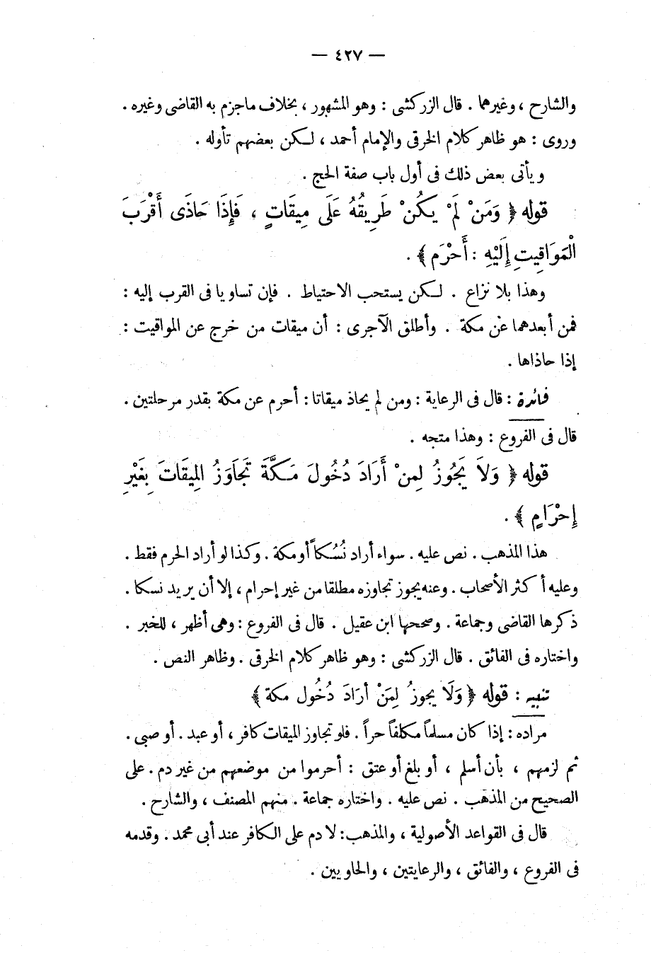 وَالشَّارِحُ، وَغَيْرُهُمَا. قَالَ الزَّرْكَشِيُّ: وَهُوَ الْمَشْهُورُ، بِخِلَافِ مَا جَزَمَ بِهِ الْقَاضِي وَغَيْرُهُ. وَرُوِيَ: هُوَ ظَاهِرُ كَلَامِ الْخِرَقِيِّ وَالْإِمَامِ أَحْمَدَ، لَكِنْ بَعْضُهُمْ تَأَوَّلَهُ، وَيَأْتِي بَعْضُ ذَلِكَ فِي أَوَّلِ بَابِ صِفَةِ الْحَجِّ.